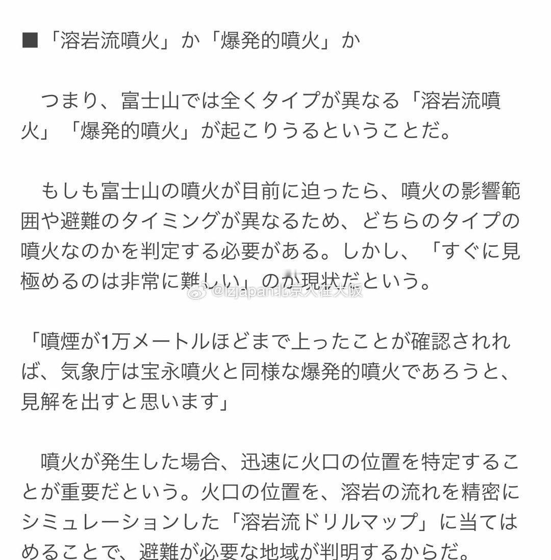 自1707年最后一次宝永火山喷发以来,富士山地下的岩浆已经积聚了300多年。日本专家表示,富士山目前处于随时可能发生喷发的状态。 “如果我们现在探测到火山地震增多等迹象,富士山可能在短短几个小时内就会喷发,”这是山梨县富士山研究所的研究主任吉本充宏告诉记者的。 事实上,伊豆群岛的三宅岛火山(1983年)和大岛火山(1986年)与富士山性质相似,它们在火山地震发生后大约两小时就喷发了。 所以吉本主任认为,“富士山也可能出现同样的情况。” 当估计位于地下20公里以上的岩浆上升并到达地表时,就会发生火山喷发。在没有任何政府机构预警的情况下,富士山有可能突然喷发吗? 吉本主任回答道“岩浆上升的过程中会逐渐破坏基岩,因此喷发需要一段时间。在此期间,可能会发生火山地震、低频地震和地壳运动。目前尚未探测到任何前兆现象,我认为它不会突然喷发。” 自人类有文字记载的历史以来,富士山大约喷发过180次。其中两次最重要的喷发分别是貞観喷发(864-866年)和宝永喷发(1707年)。 富士山可能会发生两种截然不同的喷发类型:熔岩流喷发和爆炸式喷发。 如果富士山即将喷发,就必须确定是哪种类型的喷发,因为影响范围和疏散时间会有所不同。然而,目前的情况是“极难立即确定”。 “一旦确认烟柱上升到约10000米的高度,日本气象厅可能会发布声明,称其很可能是类似于宝永火山喷发时的爆炸式喷发。” 一旦发生喷发,迅速确定火山口的位置至关重要。这是因为将火山口的位置与精确模拟熔岩流的“熔岩流钻探图”进行比对,可以确定需要疏散的区域。