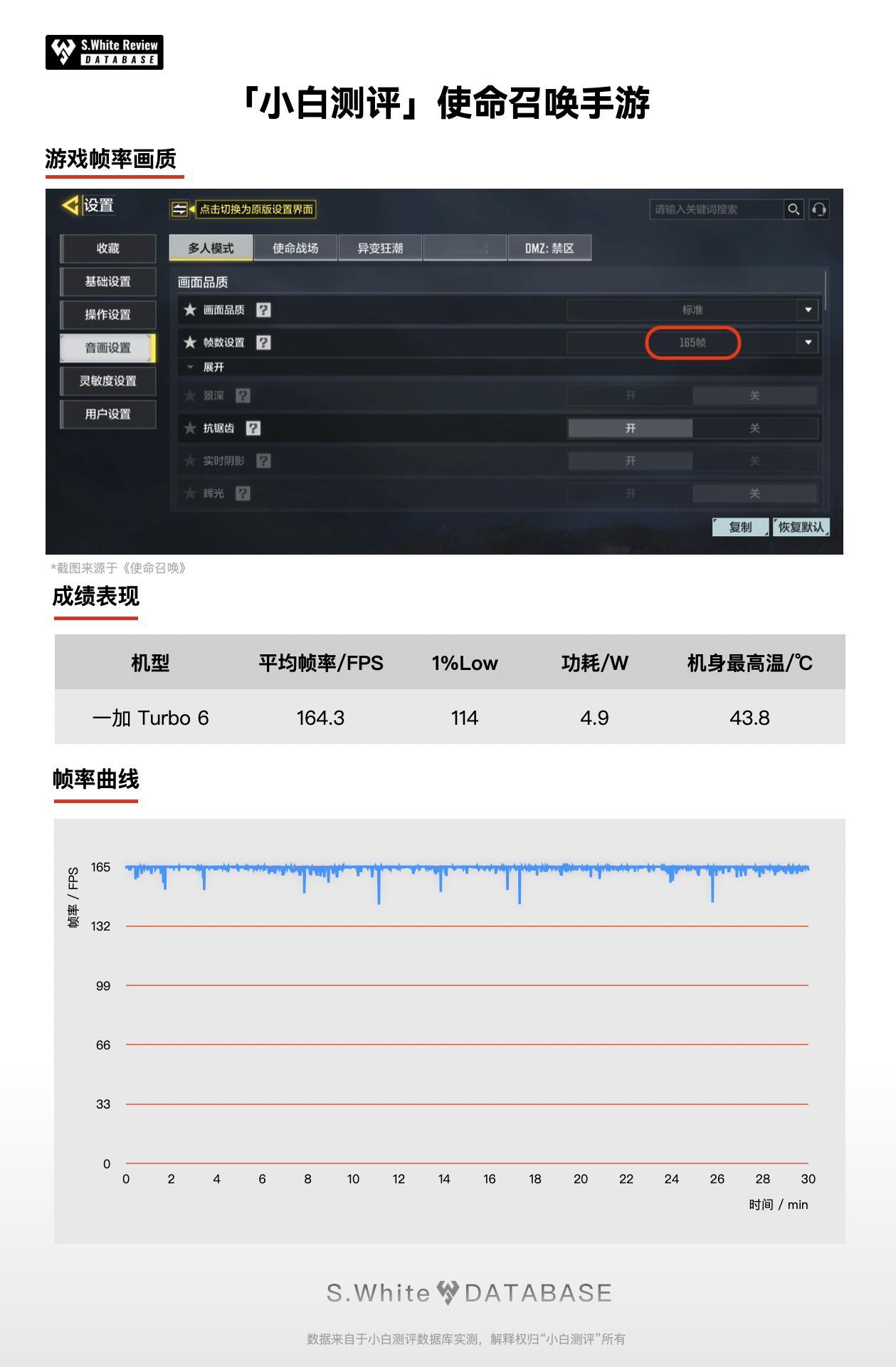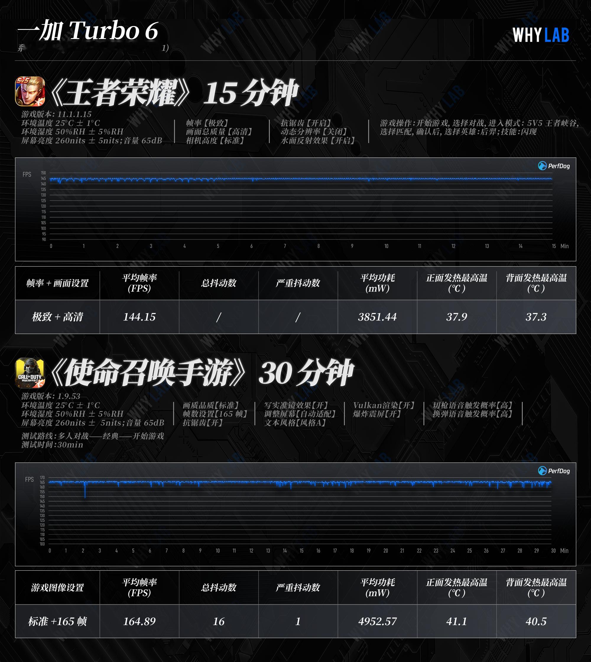 看出来了,一加是真的懂游戏。手游党都知道,MOBA和FPS类游戏都是很吃画面流畅度的,团战时掉帧、卡连招或者拉枪时延迟,光是想一想都难受。所以其实看一部手机的游戏性能牛不牛,重点不是看测试出来的数据峰值,而是整个测试图的曲线稳不稳。今天看了下小白测评和WHYLAB发的一加 Turbo 6游戏实测数据,帧率都非常稳。看小白测的王者荣耀,帧率做到144满帧运行,使命召唤做到164.3。在WHYLAB的实测数据中,使命召唤稳定保持在164.89帧,已经无限接近165Hz满帧了,王者荣耀也能做到稳定在144Hz满帧,这真的是同档独家的游戏体验。从他俩游戏测试的结果来看,一加这款新机性能释放真的强,不管游戏过程中多激烈,都保持着高帧率,且能稳定成一条直线。为啥一台Turbo能做到这种程度的高性能,我分析主要是这次搭载了特调的骁龙8sGen4风驰版,有着风驰游戏内核的加持,再到“电竞三芯”与散热架构,提升触控、网络和稳定性,想要体验从头到尾都流畅的游戏,简直不要太轻松。一加Turbo6游戏实测 一加Turbo6