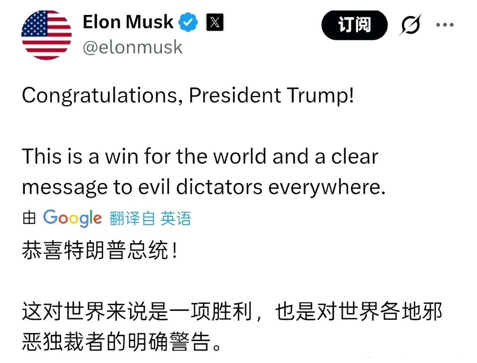 马斯克更换了头像 并向特朗普表示祝贺