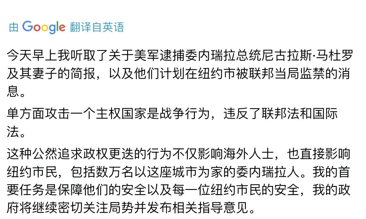 刚上任两天的纽约市长马姆达尼表示 美军逮捕委内瑞拉总统马杜罗的行为违反联邦法和国际法