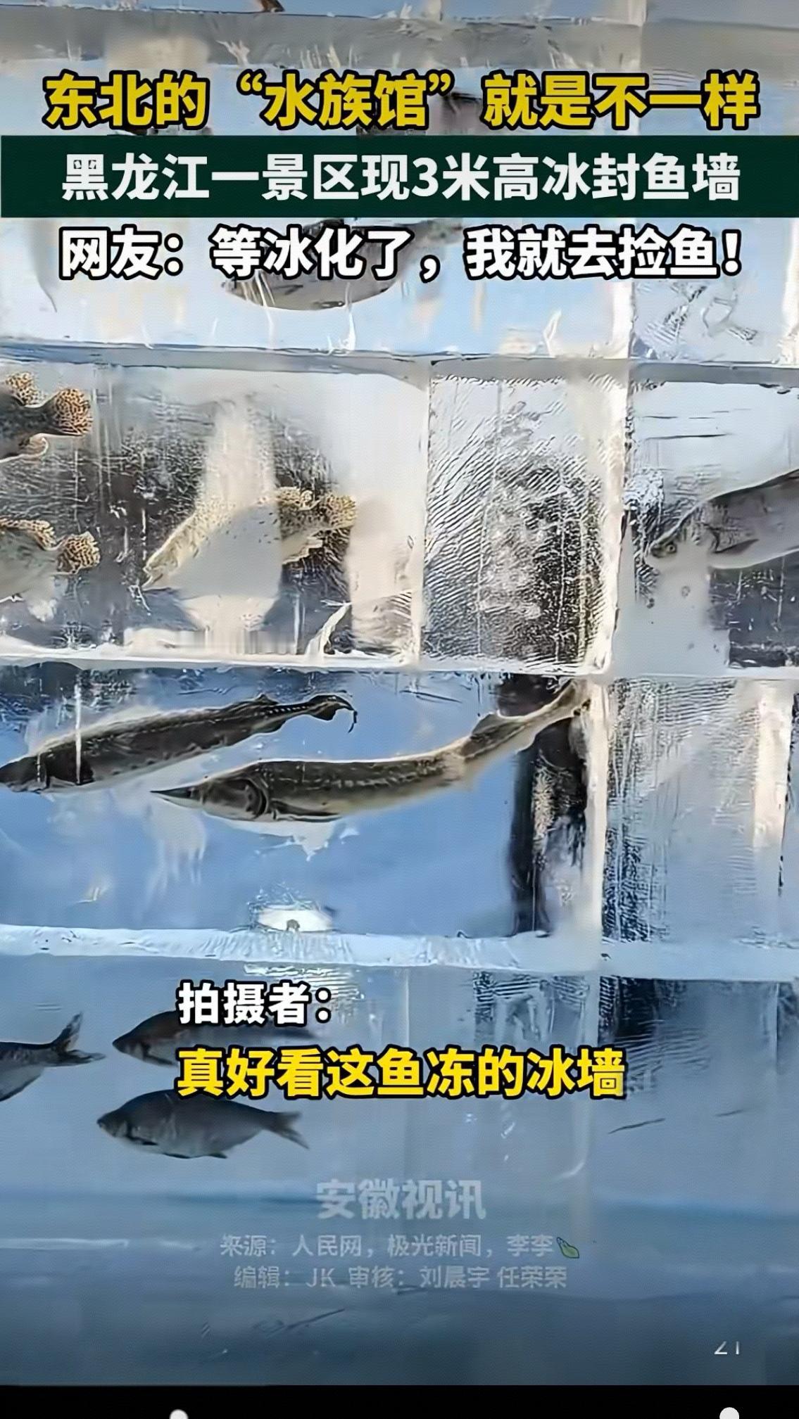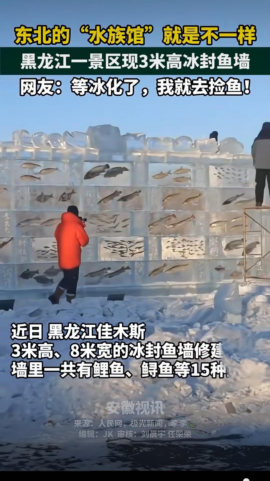 东北的“水族馆”就是不一样!黑龙江3米冰封鱼墙火了,网友:冰化了我去捡鱼 近日黑龙江佳木斯,一面3米高、8米宽的冰封鱼墙惊艳全网,墙里藏着鲤鱼、鲟鱼等15种鱼,活脱脱把寒冬变成了天然展览馆。 有网友开玩笑:“等开春冰化了,我扛着麻袋去捡鱼!”这话一出,评论区直接炸锅,有人调侃“东北人囤年货的架势,连鱼都得冻成墙”,也有人羡慕“这才是刻在DNA里的冬日浪漫”。 但你以为这只是景区的噱头吗?其实背后藏着东北人的生存智慧和浪漫情怀。 零下二三十度的东北,冰就是最好的“保鲜柜”。老一辈人冬天囤菜囤肉,用冰雪锁住新鲜,如今景区把这份生活日常变成景观,让天寒地冻有了新玩法。这些鱼不是随便冻进去的,都是当地水域常见的品种,既展示了松花江流域的水产资源,也让游客直观感受到“冰天雪地也是金山银山”。 有人说“这墙看着冷,心里却暖乎乎的”,是啊,在南方人还在纠结羽绒服选多厚的时候,东北人已经把寒冬玩出了花。冰雕、雪雕、冰封鱼墙,每一样都是对生活的热爱。这面鱼墙,冻住的是鱼,冻不住的是东北人热辣辣的生活气。 也有网友较真:“冰化了鱼不就臭了?”其实景区早有安排,等天气转暖,这些鱼会被妥善处理,有的做成科普标本,有的用于生态养殖。既不浪费,又延续了这份冬日限定的快乐。 说到底,这面冰封鱼墙火的不是鱼,是东北人把日子过成诗的本事。在天寒地冻里,照样能折腾出热气腾腾的精彩。 你觉得这面冰封鱼墙够不够硬核?如果冰化了,你真的会扛着麻袋去捡鱼吗?评论区聊聊!