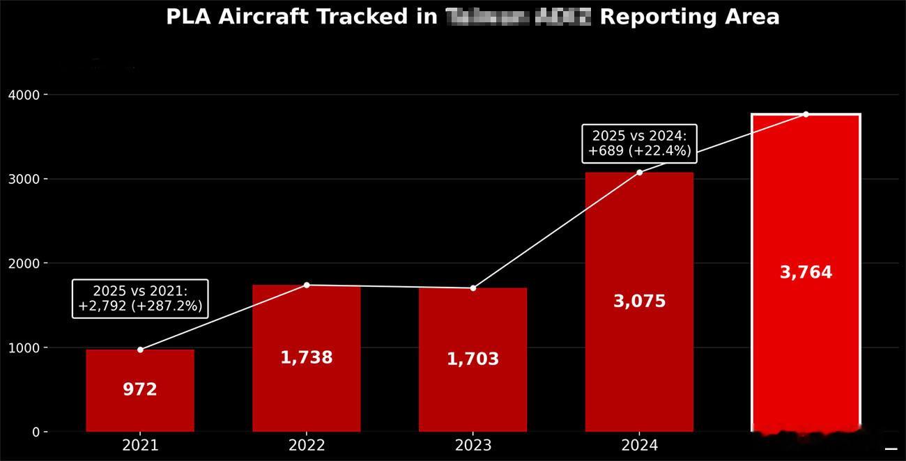 台防务部门2021至2025年在台周边发现的解放军战机次数,五年间增加了近四倍。正义使命2025演习