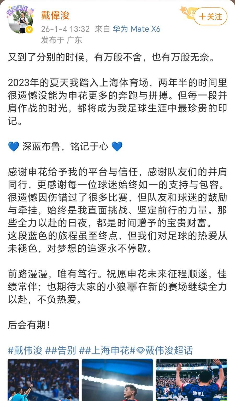 戴伟浚发文告别上海申花:深蓝布鲁、铭记于心!媒体报道戴伟浚接下来将加盟深圳新鹏城,目前本人ip已经显示在广东。 戴伟浚是2023年7月加盟上海申花,2024赛季租借到深圳新鹏城半年,戴伟浚的数据也停留在2024赛季,整个2025赛季大部分时间在养伤,伤愈也没有获得出场时间。戴伟浚已经不适合申花的战术体系。分手对于双方来说是双赢。 面临同样情况的,还有谢鹏飞! 上海申花