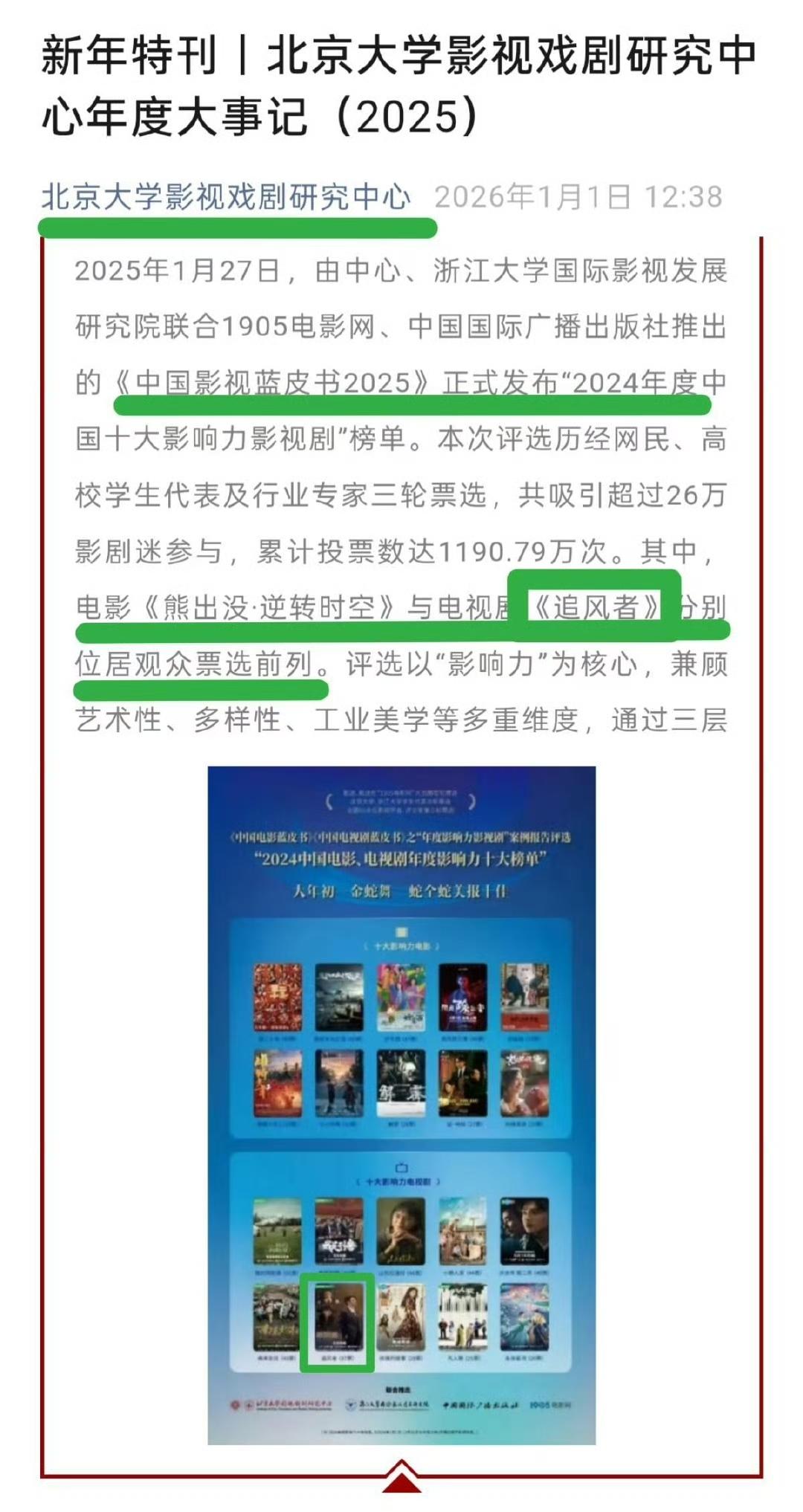 优秀演员的好剧始终会“有名字”,王一博主演的《追风者》再度榜上有名! 北京大学影视戏剧研究中心、《中国影视蓝皮书2025》正式发布“2024年度中国十大影响力影视剧”榜单,其中,电视剧《追风者》和另一部电影分别位居观众票选前列。 《追风者》中王一博饰演的魏若来真的深入人心,不但让王一博拥有了更广泛的路人缘,也让王一博一向以来因为黑营销的诋毁和大众偏见而被低估的演技得到了肯定。 王一博 王一博追风者