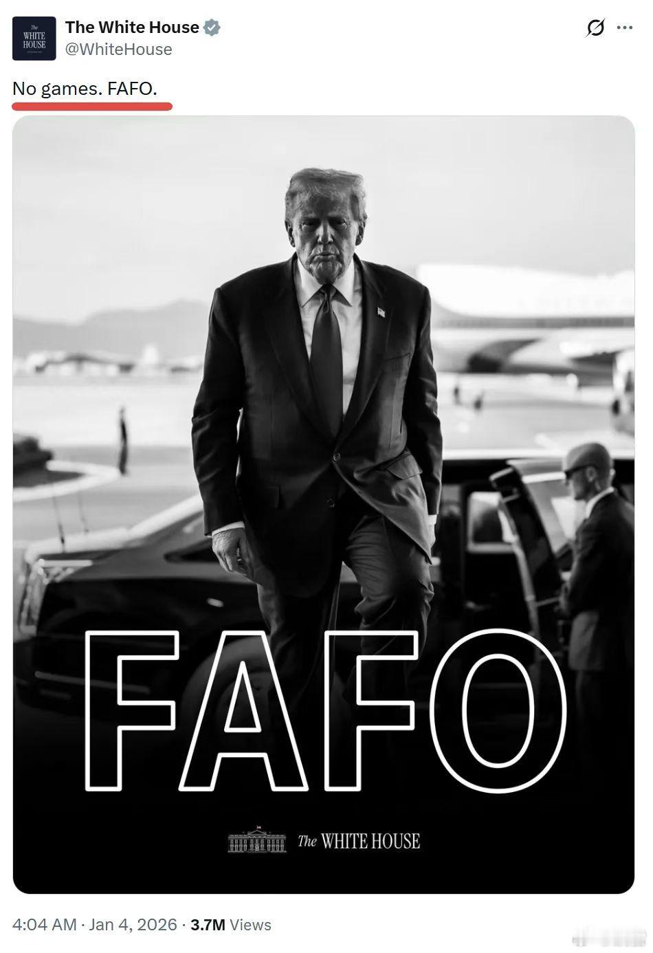 美国版猩球崛起1 月 4 日,白宫官方账号发布了一张气势十足的海报,配文同样霸道:No games. FAFO.其中,“No games” 传递出一种“不开玩笑、动真格的(deadly seriousness)”态度,语气冷硬直接。“FAFO”是 “F**k Around and Find Out” 的缩写(体面版可写作“Fool Around and Find Out”),意思是“胡作非为,后果自负”,是严厉的警告语(《韦氏词典》:FAFO: an expression of warning)。《华盛顿邮报》(2023)曾用“if they play with fire, they might get burned (玩火自焚)” 来阐释“FAFO”的内涵。海报中,特朗普神情坚毅,仿佛在以面部表情诠释“absolute resolve”这一行动代号。背景中的飞机、安保与车辆构成典型的权力场景,黑白色调进一步剥离现实杂色,以冷峻的视觉语言强化了严肃、权威与历史瞬间的质感。不得不说,白宫媒体团队深谙社交媒体流量密码之道。一张自带“历史定格感”的黑白海报,配上一句街头味十足的“FAFO”,完美传递出特朗普式“虽远必诛”的气势。