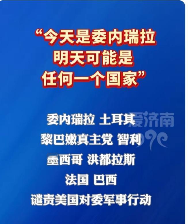 今天是委内瑞拉,明天就可能是任何一个国家。 2026年1月3日美国派兵强行控制委内瑞拉总统马杜罗夫妇并移送出境,多国表示反对;中方对此表达严重关切,指出美方行径违反国际法及《联合国宪章》宗旨和原则,呼吁美方确保二人安全、立即释放,停止颠覆委政权并通过对话谈判解决问题;相关声音还指出,美方此举破坏国际公平与安全秩序,存在“今天是委内瑞拉,明天就可能是任何一个国家”的潜在风险。