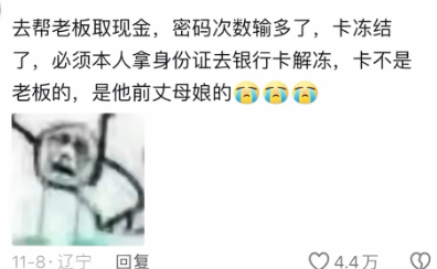 去帮老板取现金,密码次数输多了,卡冻结了,必须本人拿身份证去银行卡解冻,卡不是老板的,是他前丈母娘的