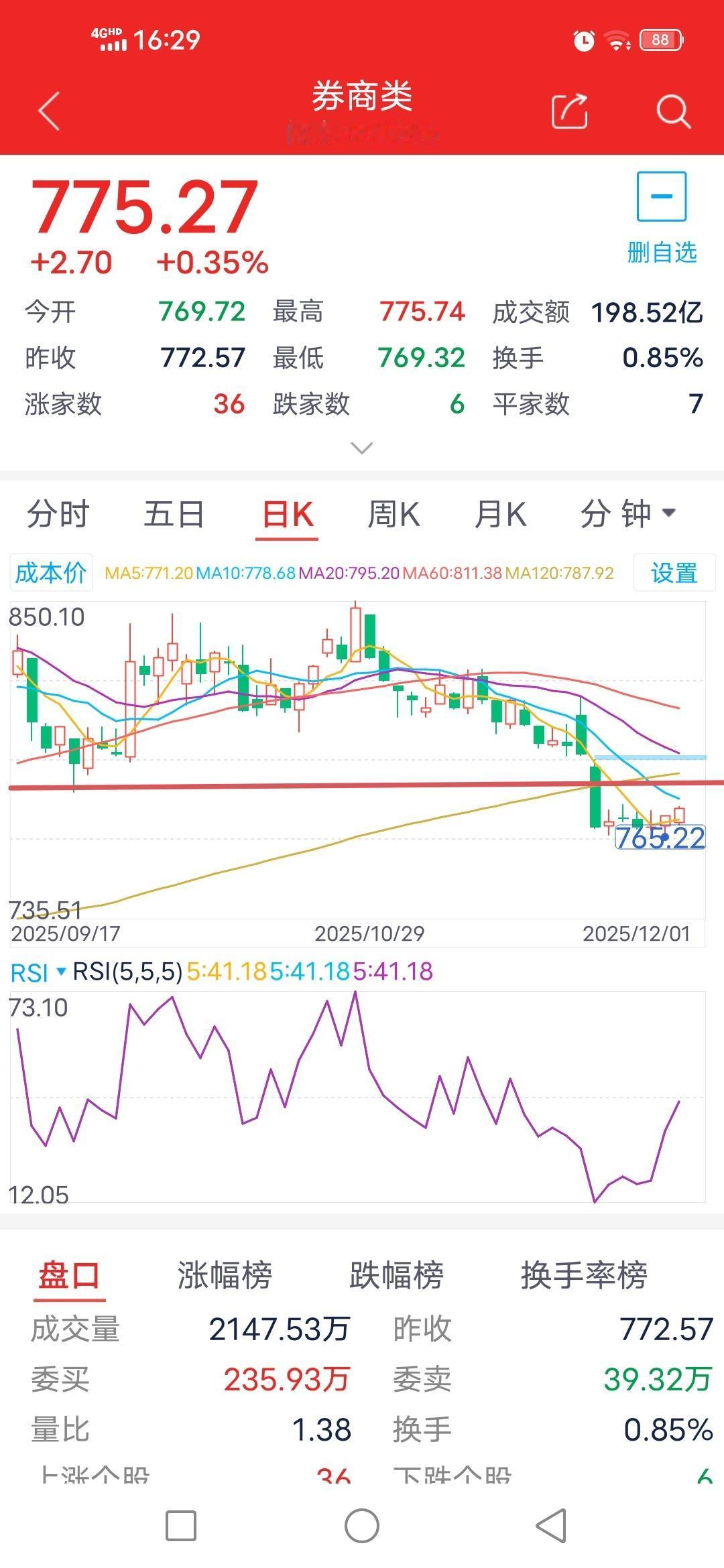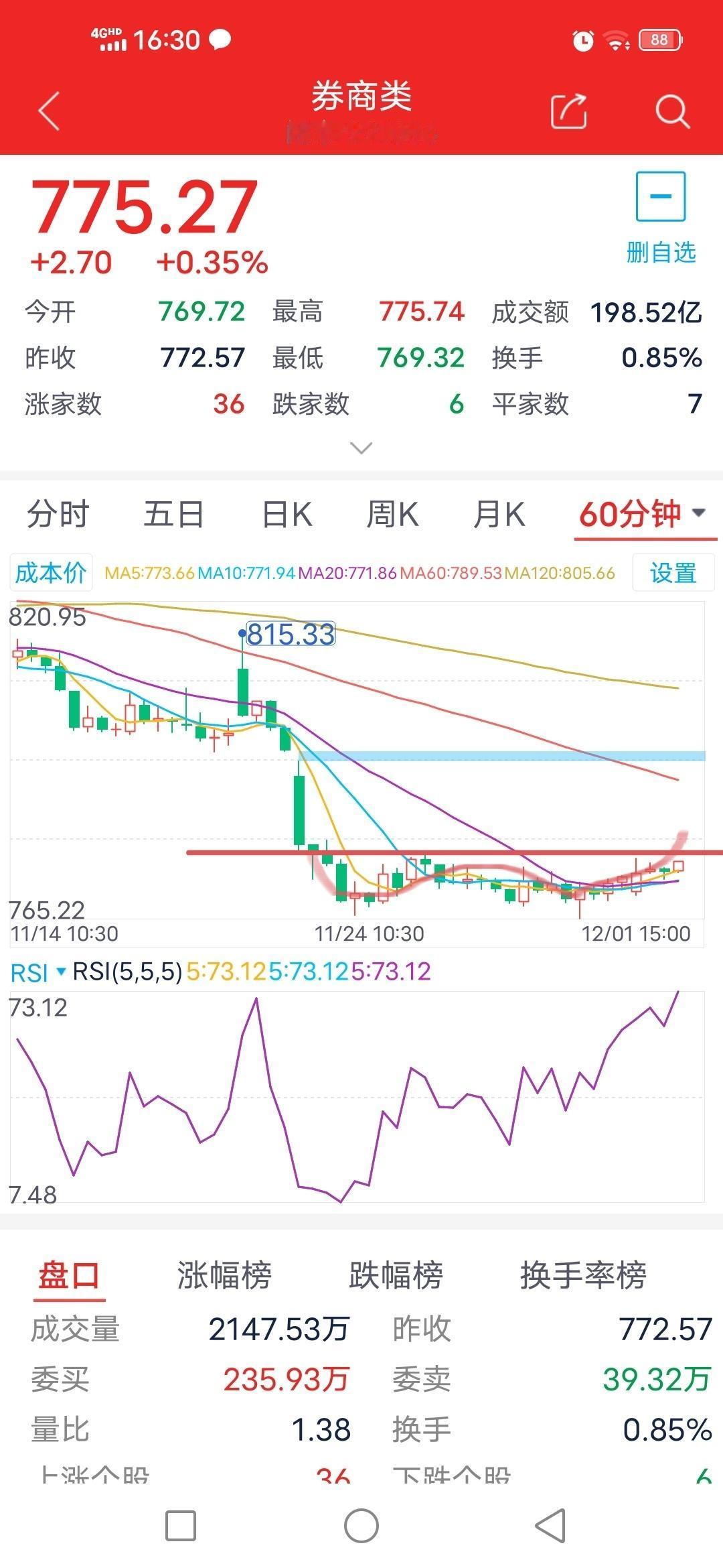 还在迟疑什么?12月2日券商板块走势预测 截至今日下午收盘,券商板块收于775.27点,处于近几日收盘价的最高位。全天最高价为775.74点,仍未超过这几日的最高价776.66点,还在迟疑什么?还是主力刻意为之? 从30分钟级别来看,已形成双底结构,且已站稳5日至60日等多条均线,技术指标呈多头态势。明日只要突破776.66点,便会继续上行。 从60分钟级别来看,已站稳5日、10日和20日均线,明日将继续向上运行。 日线级别上,连续两天站上5日线,明日压力位为20天线的778点和781点。 操作建议:近几日一直在776.66点和765点的箱体内反复震荡,明日主要关注能否突破这一箱体,并重新站上前期重要点位781点,多看少动,技术指标没有转多的情况下不要轻易进场。