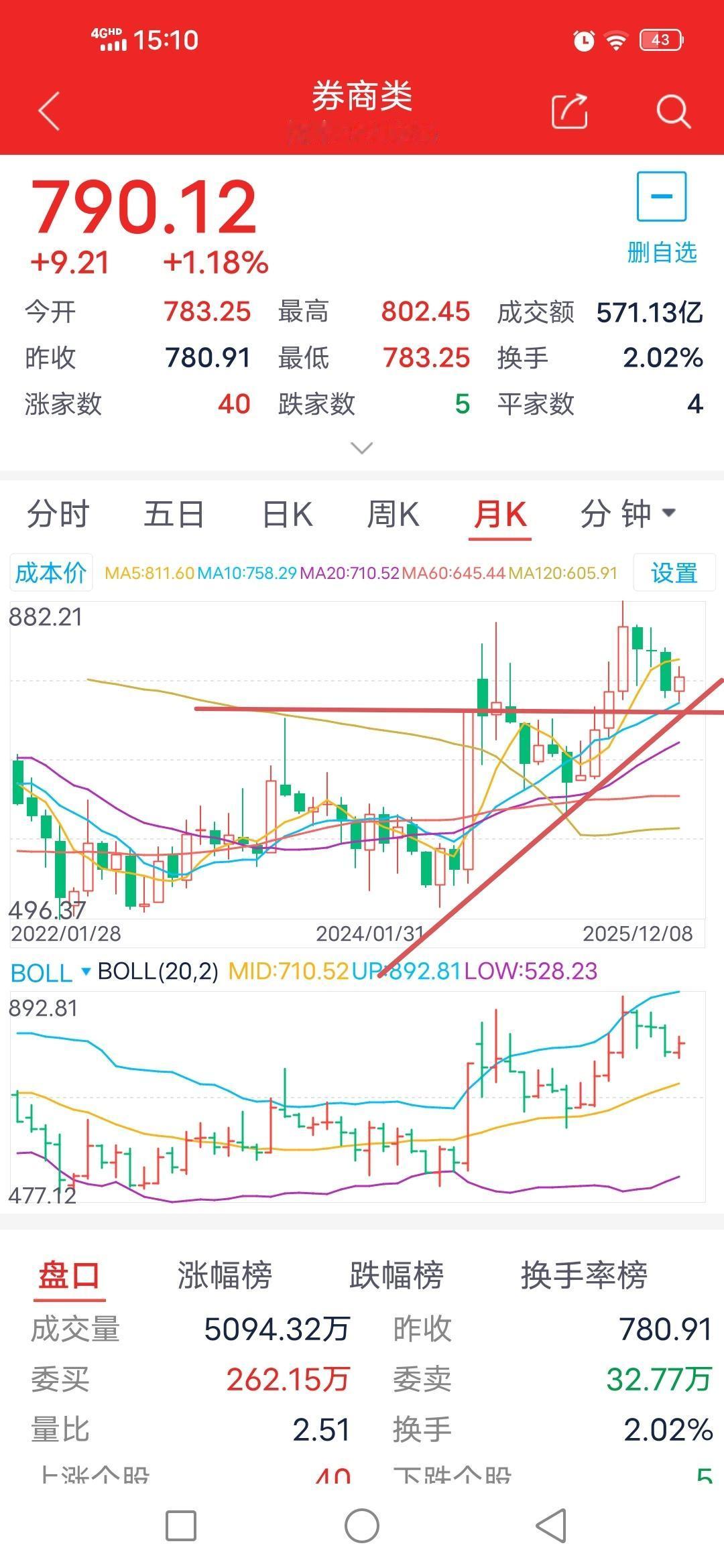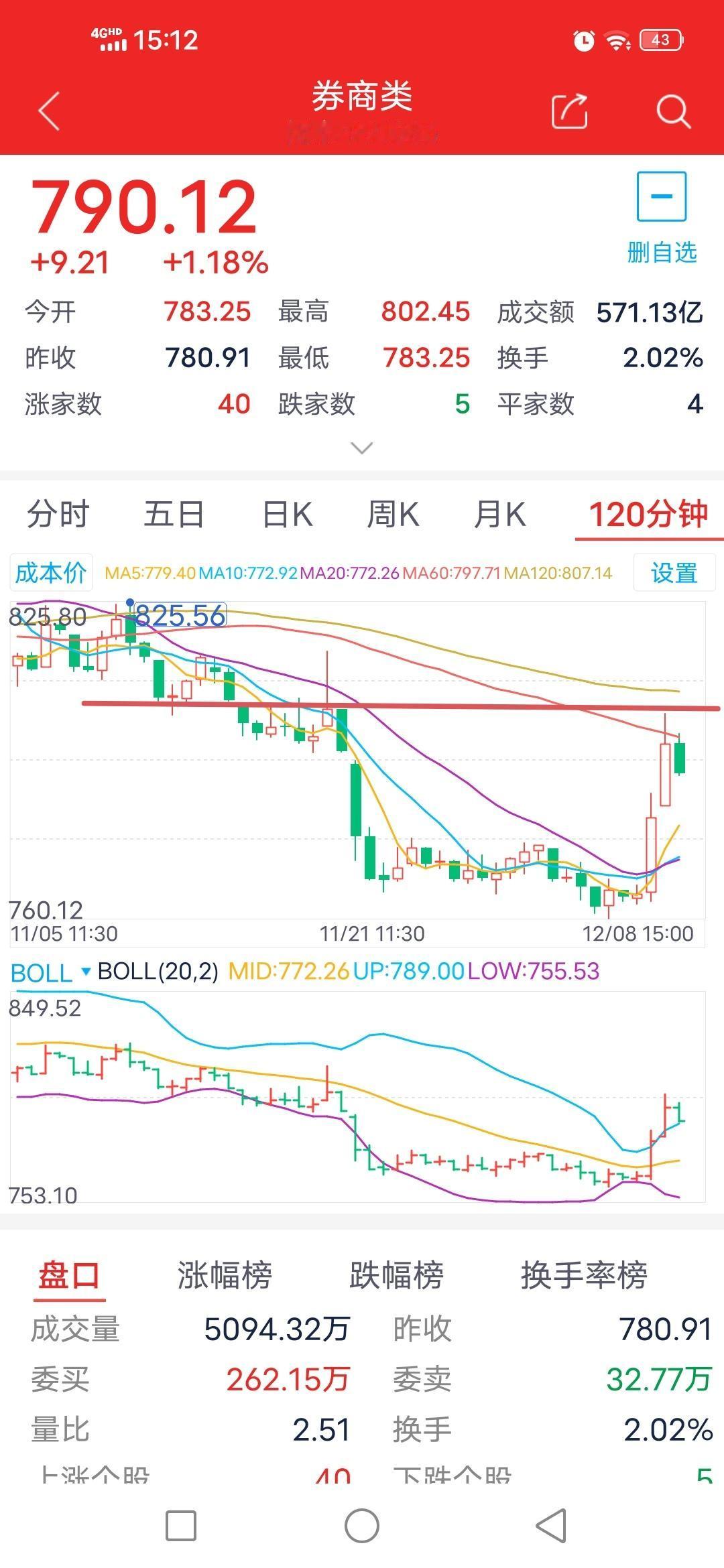 冲高回落,后续走向如何?12月9日券商板块走势预测。 经过上周五的上涨,分钟级别和日线级别技术指标保持良好,再加上受利好消息的推动,券商板块今日高开于784.14点,此点位亦是今日的最低点。随后冲高至802.49点,而后回落,最终收于120天线下方的790.12点。这基本契合昨日的预期:“冲高回补此前的跳空缺口后,会回调考验5日线的支撑力度”。 从日线级别来看,上周五券商板块站上5日线和10日线,今日又成功站上20日线,呈现多头排列,属于强势反弹。 从周线级别分析,今日首次站上5周线,接下来需关注能否实现有效突破。从技术指标来看,目前板块运行于如图所示的下降通道内,下有支撑,上有压力。 从月线级别而言,调整空间应当有限,下方的740点应是一个较强的支撑位。 操作建议方面,明日可关注下方20日线的支撑,以及上方120天线和60天线的压力。鉴于当前与5日线距离相对较远,若上涨至60天线,大概率会遭遇阻力,进而回踩一次5日线。小概率情况则是继续逼空上涨,有效突破60天线和月线级别上轨。