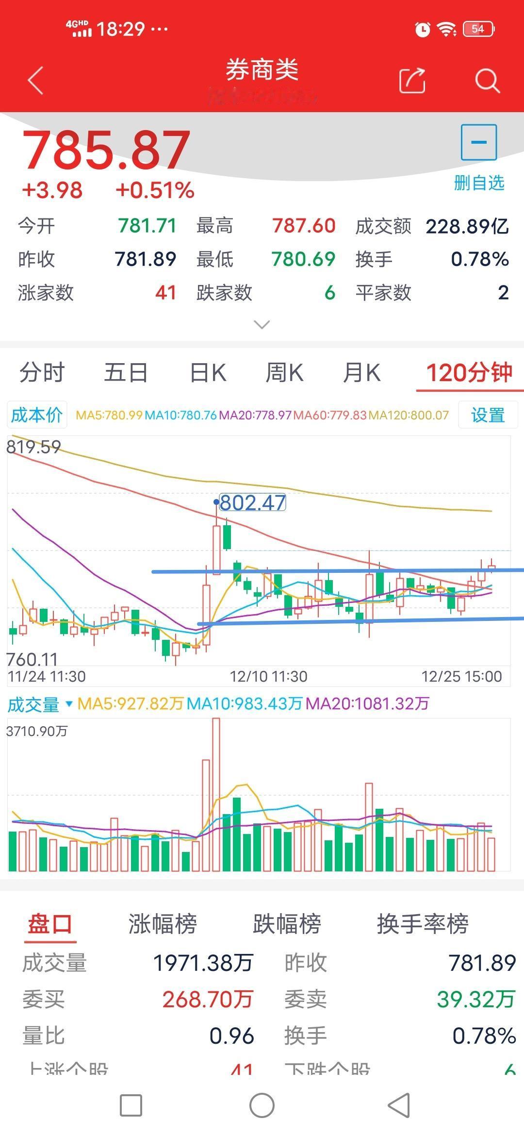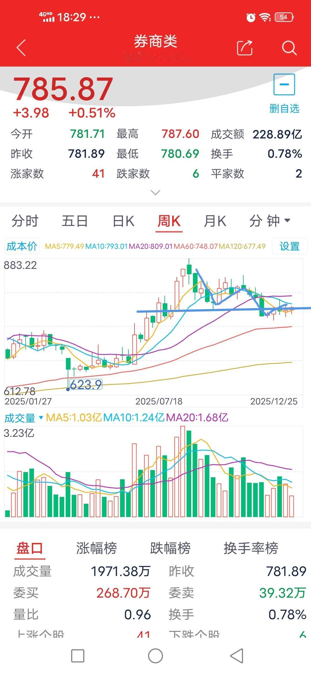 乘胜追击!明日券商板块走势预测 券商板块今日开盘781点,最高触及787点,最低探至780点,最终收盘于785点。截至今日下午收盘,该板块在60分钟和120分钟级别均突破前期运行箱体,且再度站上781点这一历经多次争夺、屡屡得而复失的关键点位。 日线级别已形成新的头肩底形态,若能成功突破如图所示的前期压力位789点,后市可继续看多。 周线级别刚刚站上781点,后续需关注能否站稳此点位,并进一步向上突破。