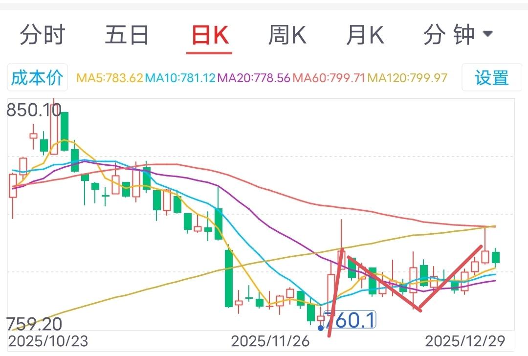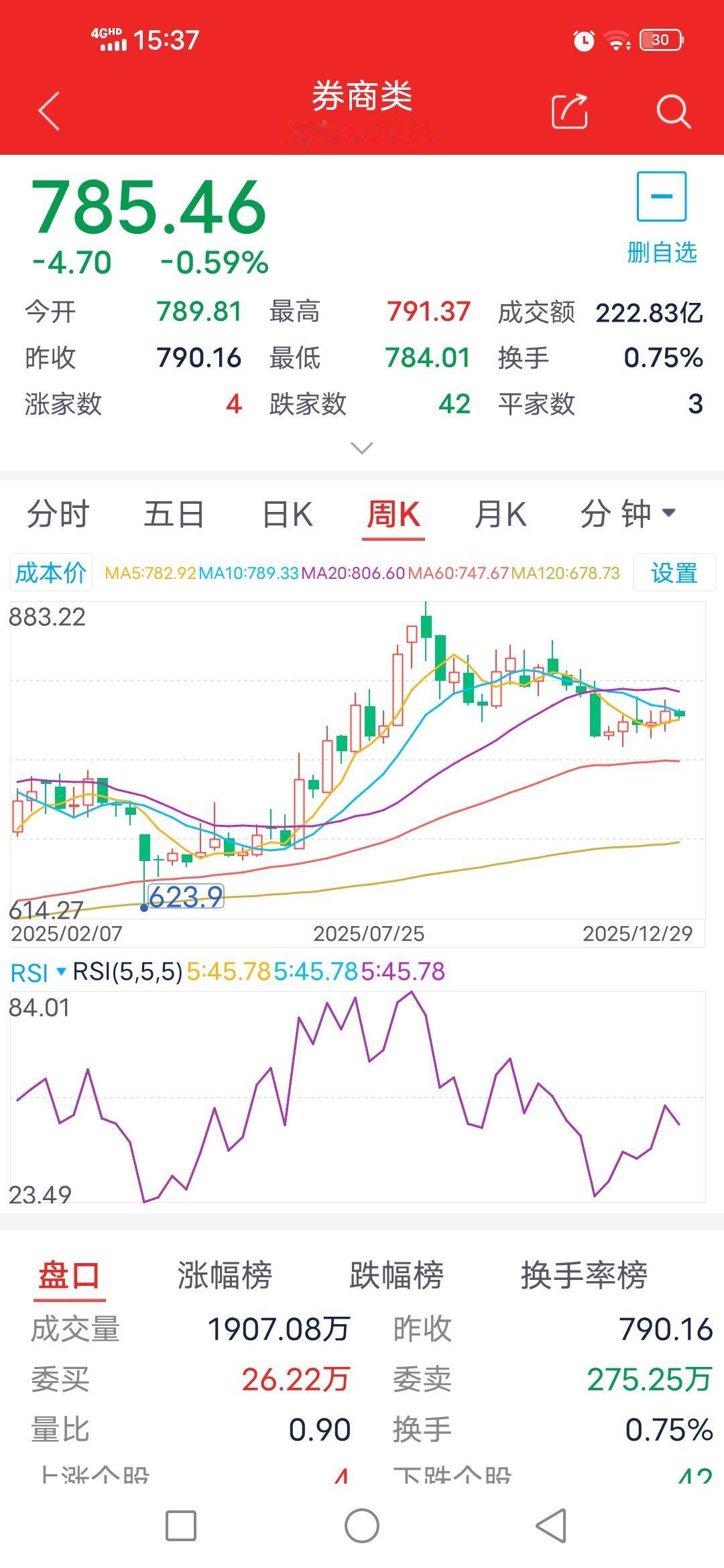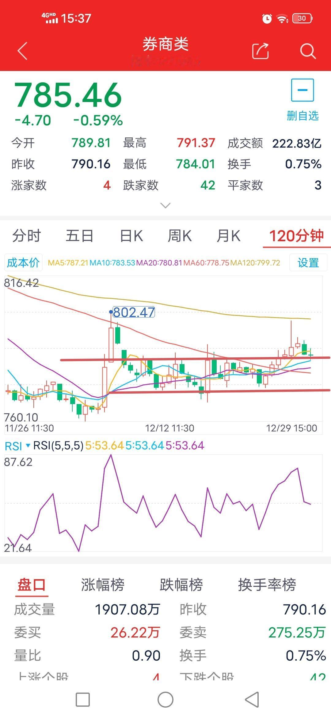 上周五果真为脉冲诱多?周二券商板块走势预测 今日券商板块开盘于789点,最高达791点,最低探至784点,最终收于785点,量能较昨日有所缩减,缩量调整应该是好事。 从60分钟和120分钟级别分析,上午冲高至前高789点后便一路下行,回落至784点支撑位后,最终收于785点,再度回到前期高点789点之下。好在未跌破前期箱体上沿,今日看来箱体突破仍算有效。 从日线级别看,今日调整至5日线附近获得支撑,即便明日继续低开下行,还有10日线和20日线支撑,只要未跌破20日线,便问题不大,圆弧底形态依旧完好。 周线级别处于789点和783点这一狭小区间,变盘时刻应很快来临,这两个点位至关重要,关乎方向选择。 2025年仅剩两个交易日,日线和周线情况尚难确定,但年线3年阳应无悬念。谁说券商板块是“渣男”?