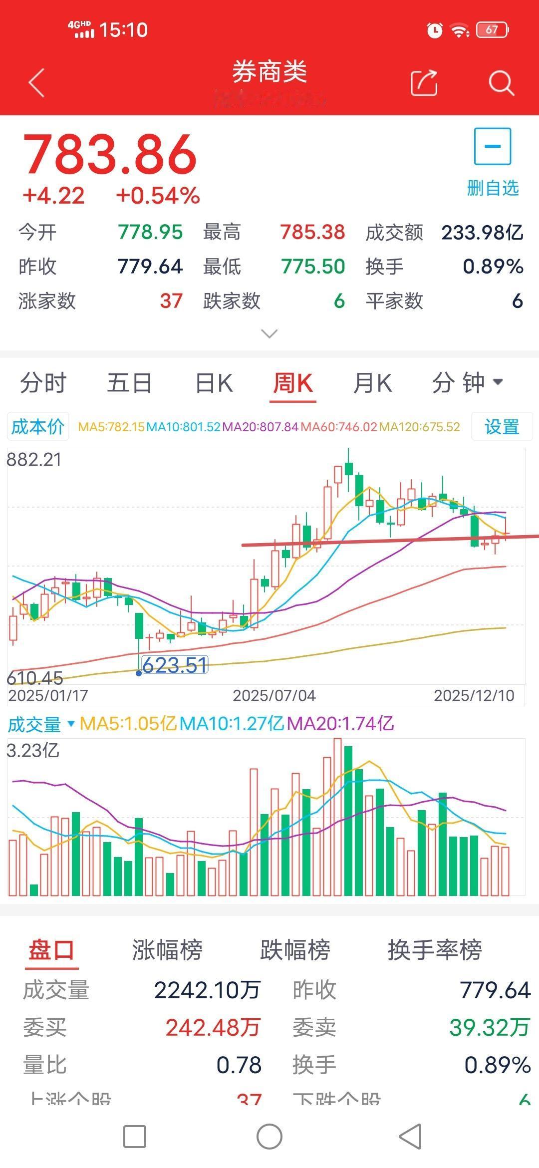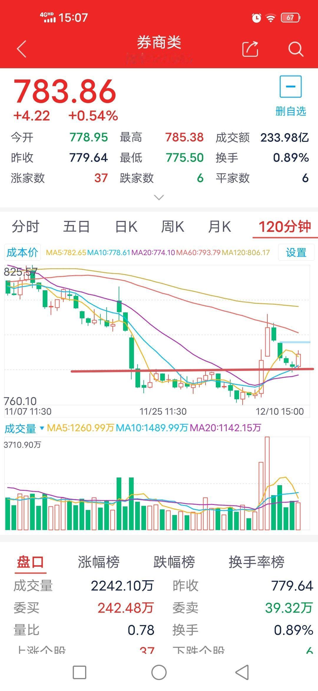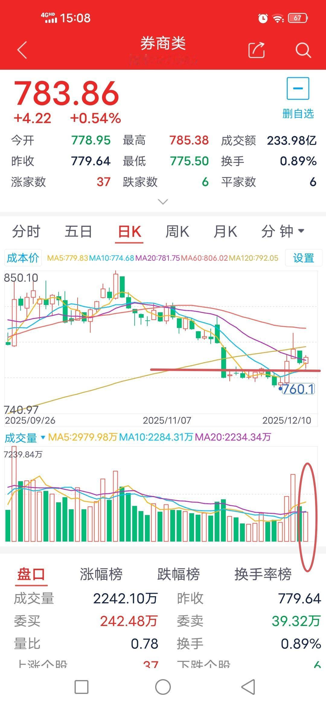 缩量反弹,券商板块后续走向如何? 今日,券商板块开盘报778.95点,收盘于783.86点,盘中最高触及785.38点,最低下探至775.5点。 从60分钟、120分钟以及日线级别分析,今日该板块下探至前期高点775点时获得支撑,下午1:30左右开始放量上涨,直至尾盘收于783.86点,重新站上781点这一重要支撑位。 经过今日的反弹,周线级别也回升至5周线之上。 综合来看,自上周反弹回补此前的跳空缺口后,板块如期回撤至20日线并获得支撑。从技术层面判断,明日板块有望继续上行,压力位为120日线的792点。不过,今日量能大幅萎缩是一个潜在隐患。因此,若明日反弹时成交量未能增加,反弹高度将较为有限,不排除又回到781点之下震荡。