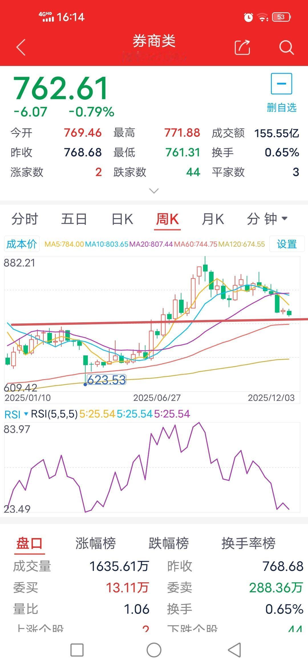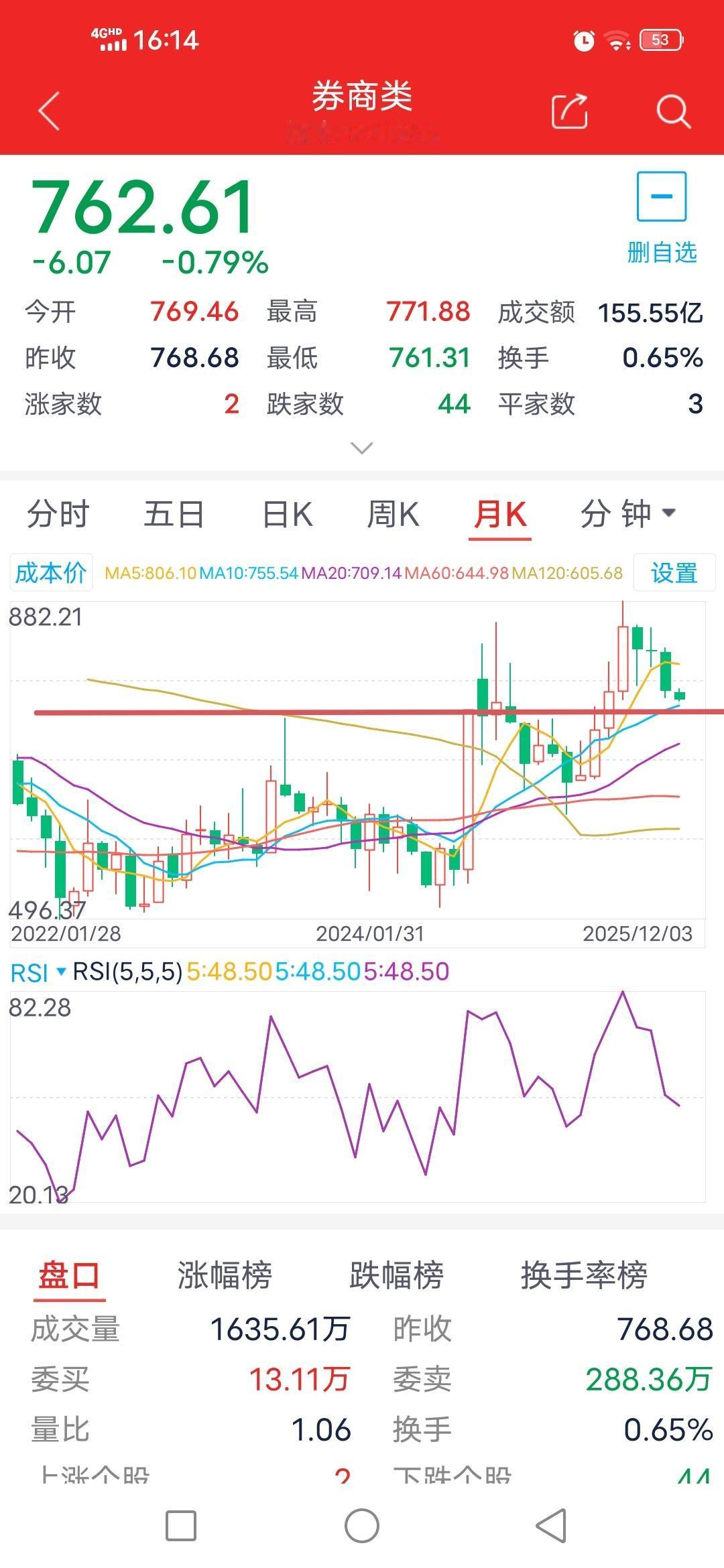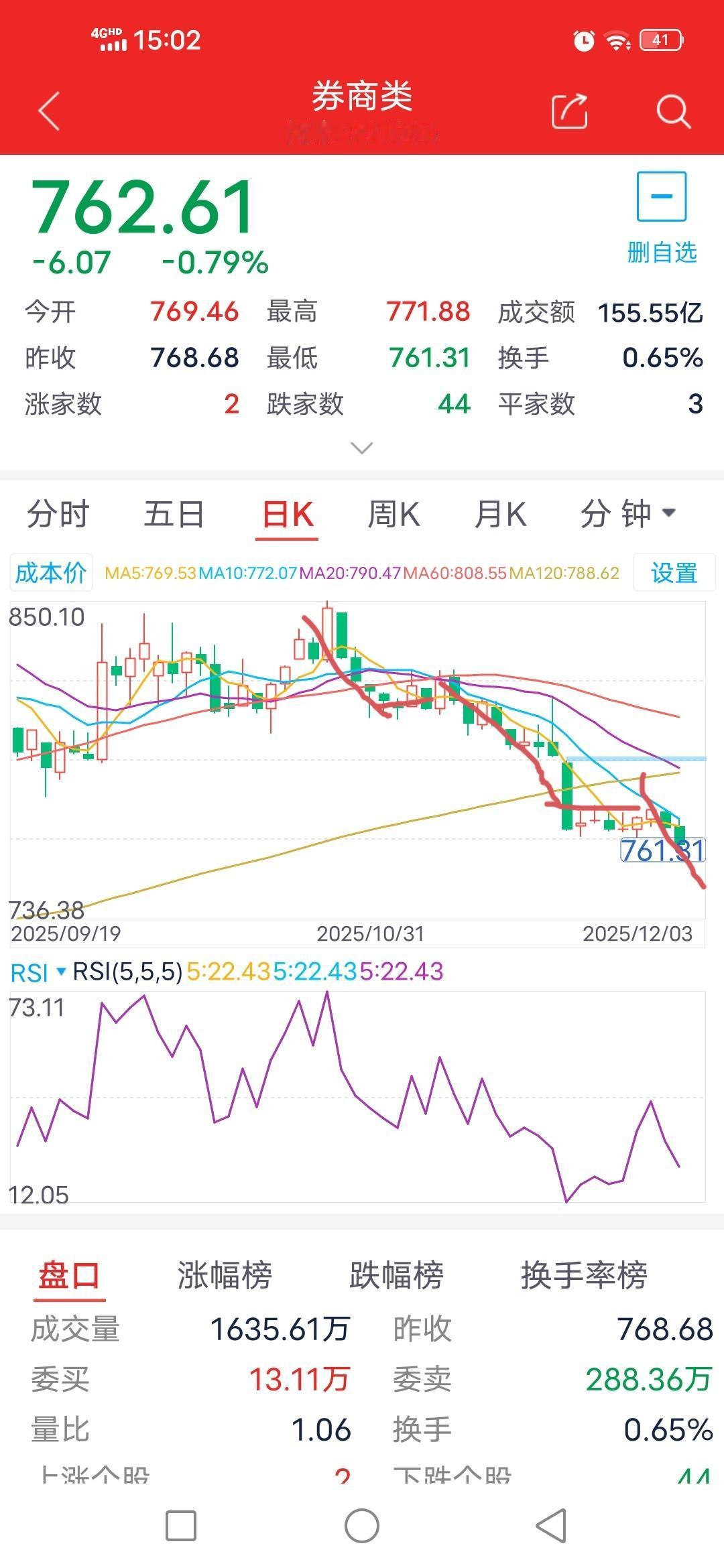 确定向下了?券商板块12月4日走势预测。 截止今天下午收盘,券商收于762.61点,盘中最高771.88点,最低761.31点。盘中创下调整以来新低761.31点。 从60分钟级别可以明显看出,今天已经向下跌破前面的箱体。 从日线级别分析,跌破765点,就意味着开始进入5浪调整。 周线和月线技术指标没有变化。 操作方面,跌破箱体,就大概率会继续向下调整,接下来就是寻找支撑位,月线级别支撑位10月线755点,周线744点,还有一个就是前期高点740点。