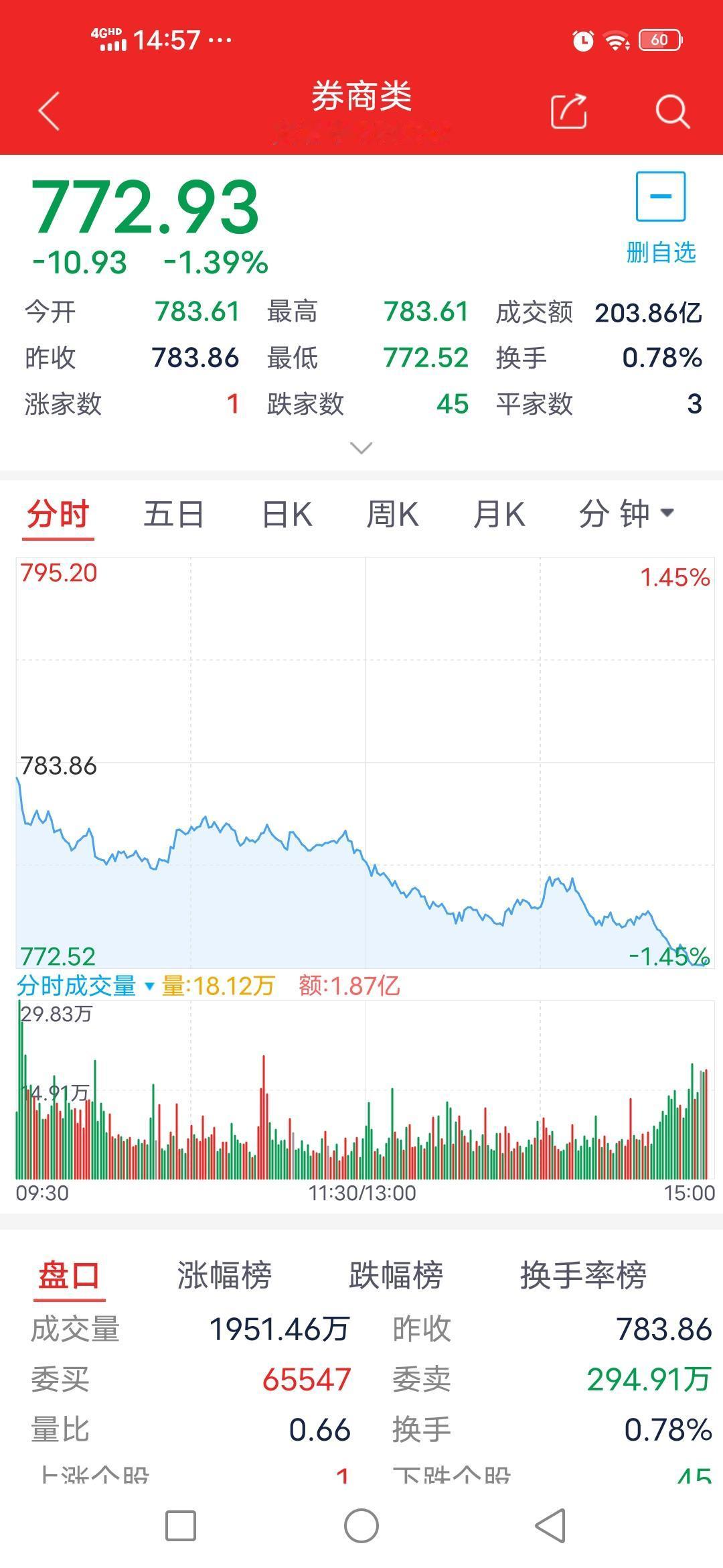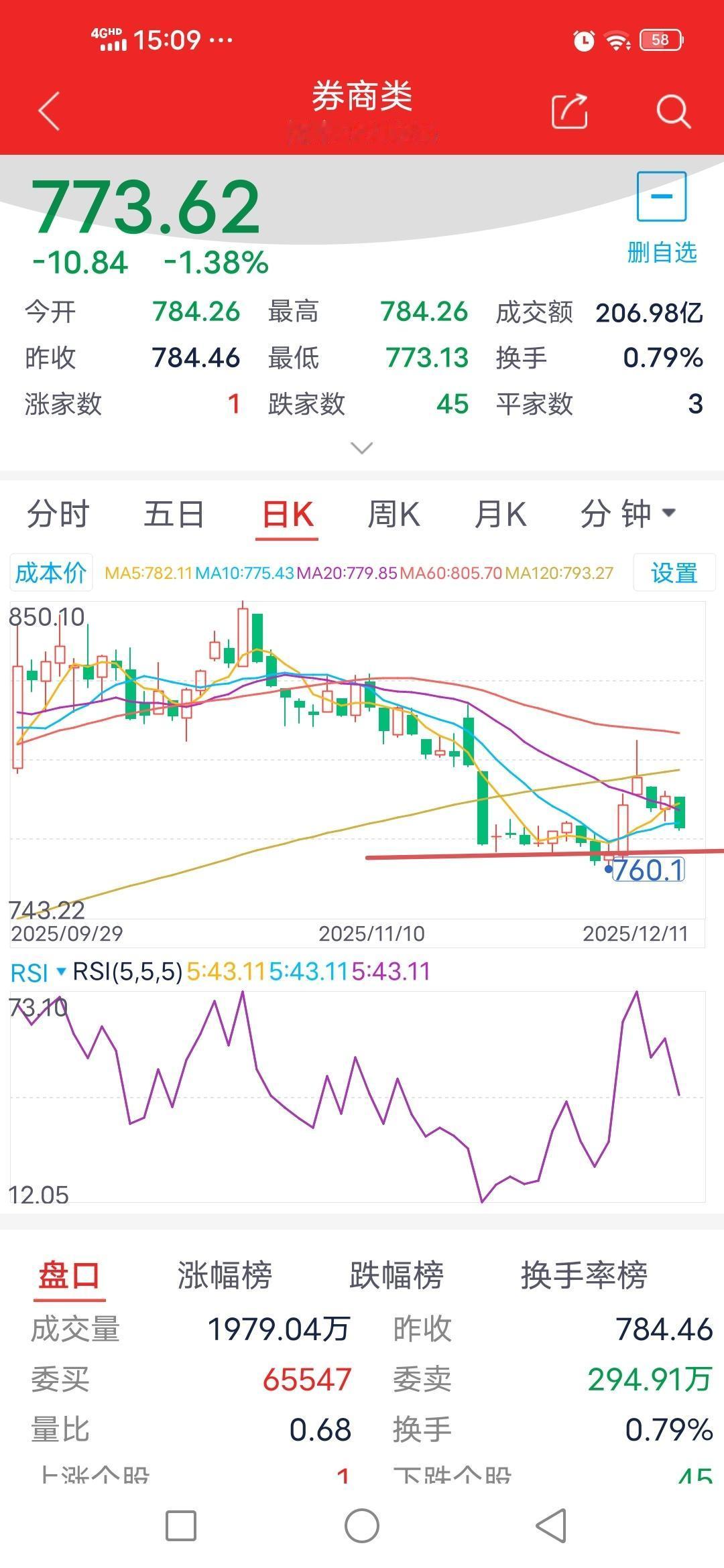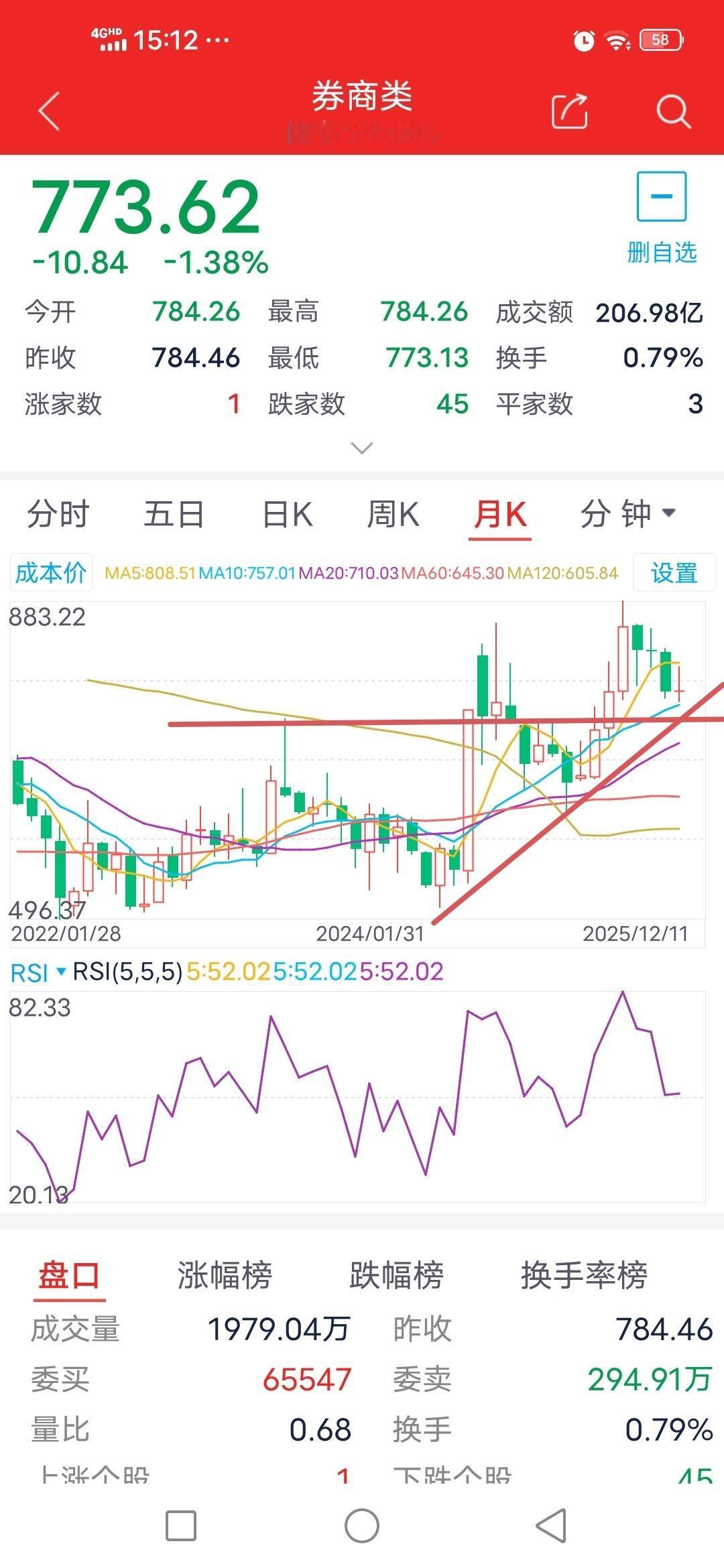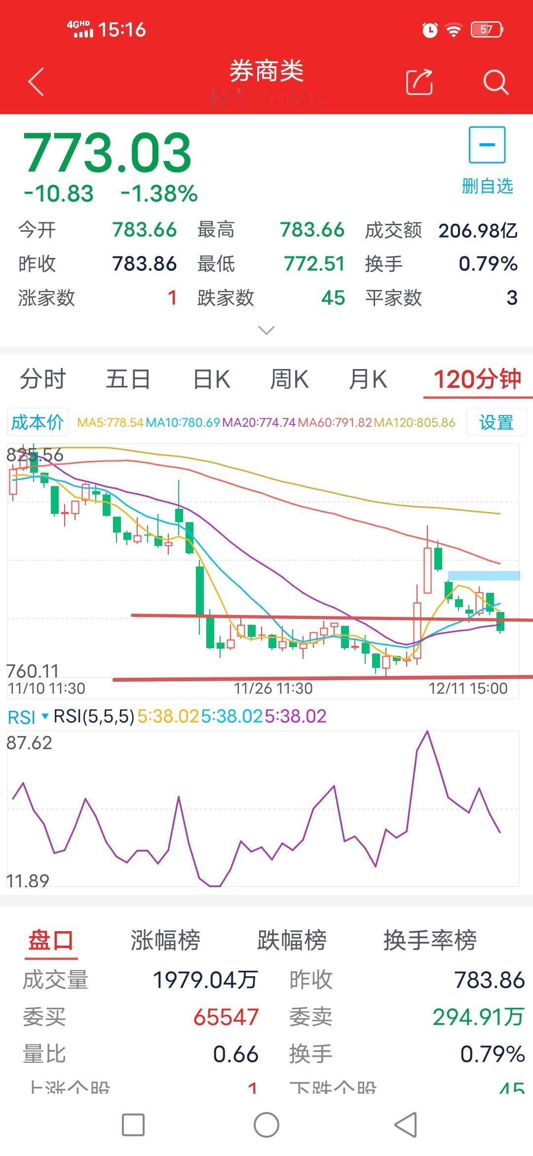 一江春水向东流。12月12日券商板块走势预测 券商板块今日以783.61点(全天最高点)开盘,一路下行,毫无抵抗之力,最终收于773.03点,跌幅达1.38%。 从日线级别来看,今日一根阴线穿过三条均线,相继跌破5日、10日、20日线,再度回到781点以下,呈现典型的空头趋势。 从60分钟和120分钟级别分析,其有可能重新回到前期的震荡通道,寻求760点的支撑,形成双底形态。 从周线级别分析,目前暂时将其视为调整4浪,后续可能还会走出5浪。 月线级别的支撑位为756点和745点。 明天先看765点的支撑力度,月线级别支撑应该会是强支撑。
