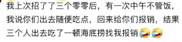 我上次招了了三个零零后,有一次中午不管饭,我说你们出去随便吃点,回来给你们报销,结果三个人出去吃了一顿海底捞找我报销