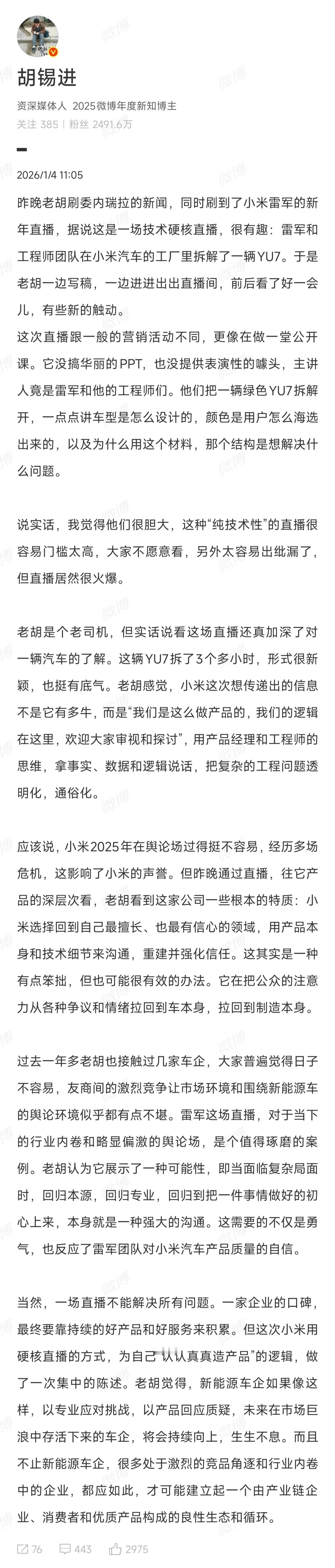 胡锡进谈雷军拆车直播正如老胡所说,拆车是个笨办法。在满世界碎片化信息的时代,花几个小时拆车,传播的效果远远不如靠嘴巴喊几句“遥遥领先”“XXX万内最佳”高效,也不如给汽车博主下商单,让他们歪着屁股做所谓的客观横评更有传播性。拆车在我看来就是六子把肚皮划开去证明自己吃了一碗粉,确实很笨很蠢,但只要了解了小米造车以来面临的超高强度造谣、抹黑、诋毁,就能明白,拆车是笨办法,是最无奈的办法,也是最有效的办法。空口无凭的遥遥领先可能会博得一时的认可,但就像罗老师说得那样,终究会成为行业笑柄。拆车很无聊,可能会没人看,也可能暴露自身的短板,但真相自有穿越时间的力量。下一次有消费者对小米YU7心动,这次的拆车视频会是他了解YU7的最佳途径。当然,敢拆车本身也代表着雷总、小米对自己造的车的绝对自信,毕竟不是所有车企都敢把自己吹得天花乱坠的车拆开来、完完全全地展示给消费者看的。相信大家前段时间也看到,有些拆车博主刚发了个某品牌的拆车预告,就惹得一身骚,最后车也没拆成。昨天看直播的过程中,也看到不少其它品牌的车主在呼吁别的品牌拆车,好让大家对自己买的产品有更深入、全面的了解,但我觉得后续跟进的品牌肯定寥寥无几。一方面,绝大多数的车不如小米YU7那样经拆——方方面面都给你同价位最好的;另一方面,也是商业模式决定的。小米从创办以来就一直努力在推动行业信息、产品信息的透明化,让消费者花钱花得明白;而绝大多数车企,还是传统厂商那套玩法,信息差越大,他们的溢价空间就越大,什么都暴露在消费者面前,他们拿什么赚钱?他们甚至去参加车展,都要把展车挡起来,故作神秘,媒体先看。希望雷总的这场直播给2026年的车圈舆论开个好头,大家都可以回归真相、回归产品,而不是造谣、抹黑、赌咒谩骂。学雷军,可以多学学拆车,不要光学穿搭。