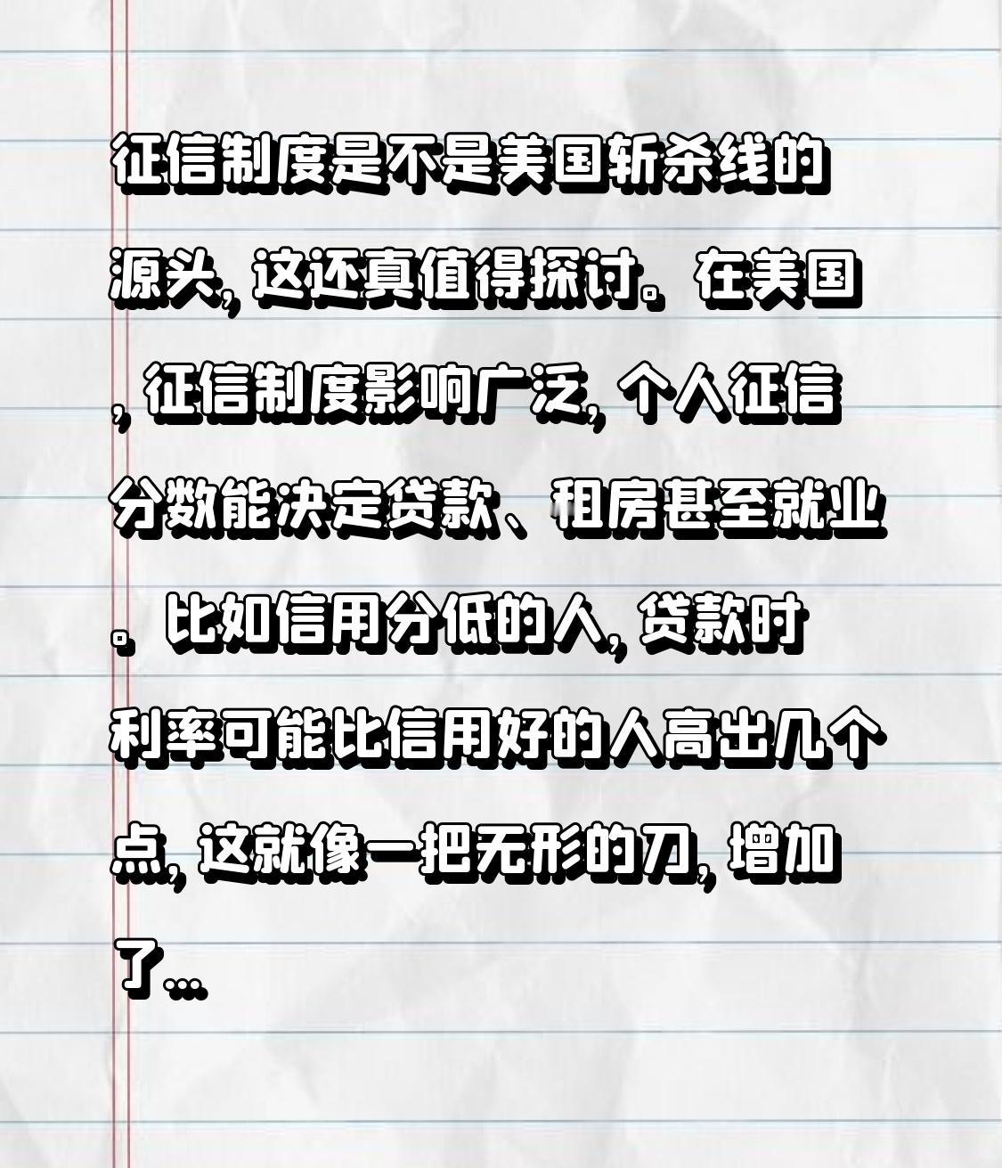 征信制度是不是美国斩杀线的源头,这还真值得探讨。在美国,征信制度影响广泛,个人征信分数能决定贷款、租房甚至就业。比如信用分低的人,贷款时利率可能比信用好的人高出几个点,这就像一把无形的刀,增加了生活成本。 从金融角度看,征信制度是金融体系的重要一环,能筛选出优质客户,降低违约风险。但它也可能成为金融机构收割财富的工具。一些人因意外情况信用受损,就会陷入贷款难、消费受限的困境。所以说它是“斩杀线的源头”有一定道理,但也不能全怪它,毕竟背后还有复杂的金融利益链条。