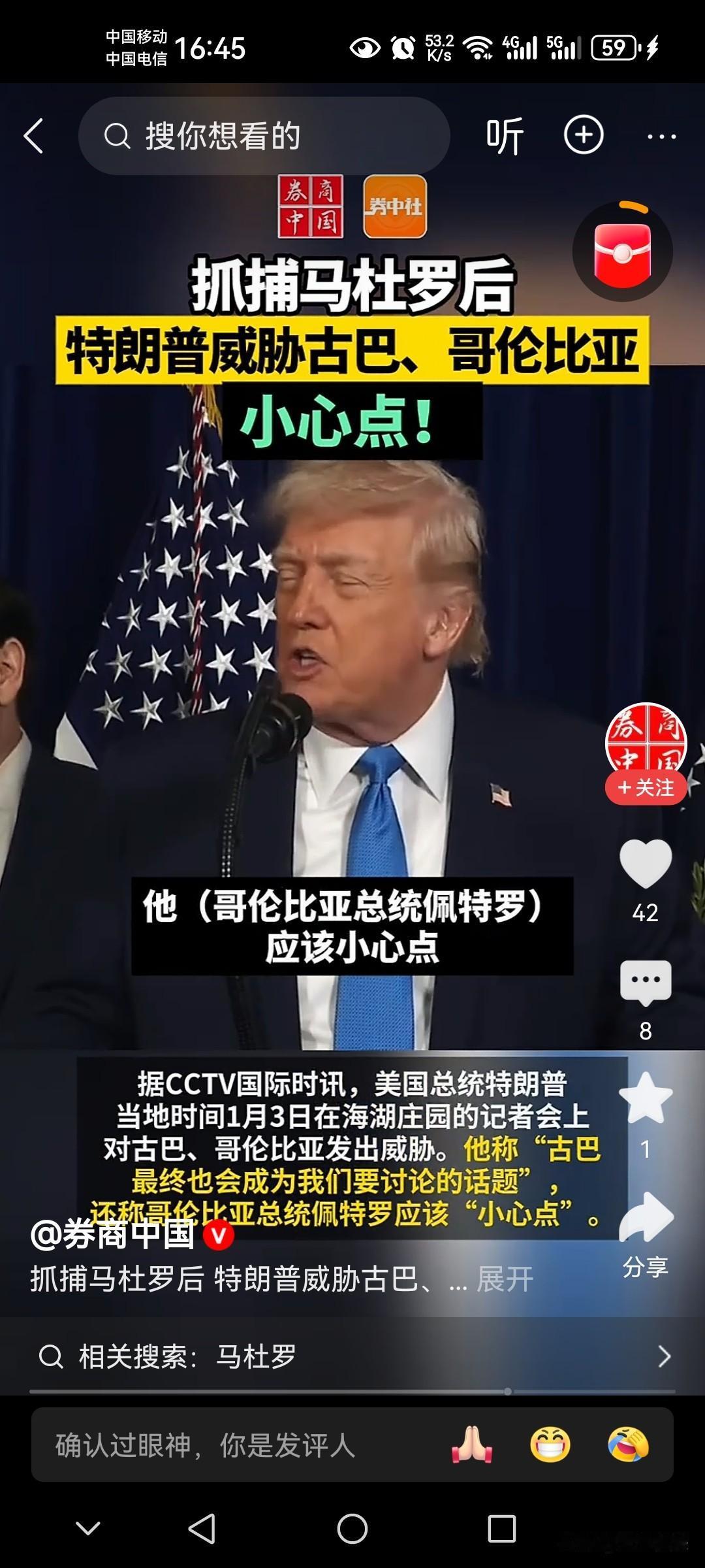 看过拽的没见过这么拽的 美国总统特郎普刚把委内瑞拉总统马杜罗抓获带回纽约,自信心膨胀了! 在海湖庄园记者会上再次大放厥词:对古巴和哥伦比亚发出威胁! 特朗普并且直接点名哥伦比亚总统佩特罗要“小心点”! 对古巴更是毫不遮掩,称古巴也会成为我们讨论的话题!言外之意也会把马杜罗剧本在古巴或者南美国家重演! 这就是世界规则,实力决定一切!实力决定地位和话语权! 美国这么拽就是因为美国无论军事、科技、经济都是世界独一无二的,强大的到得有对手!海湖庄园记者会 哥伦比亚总统