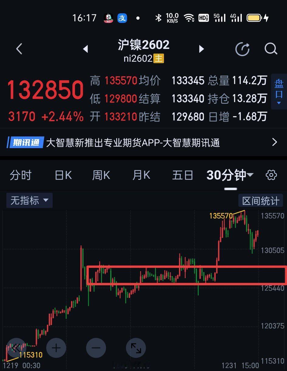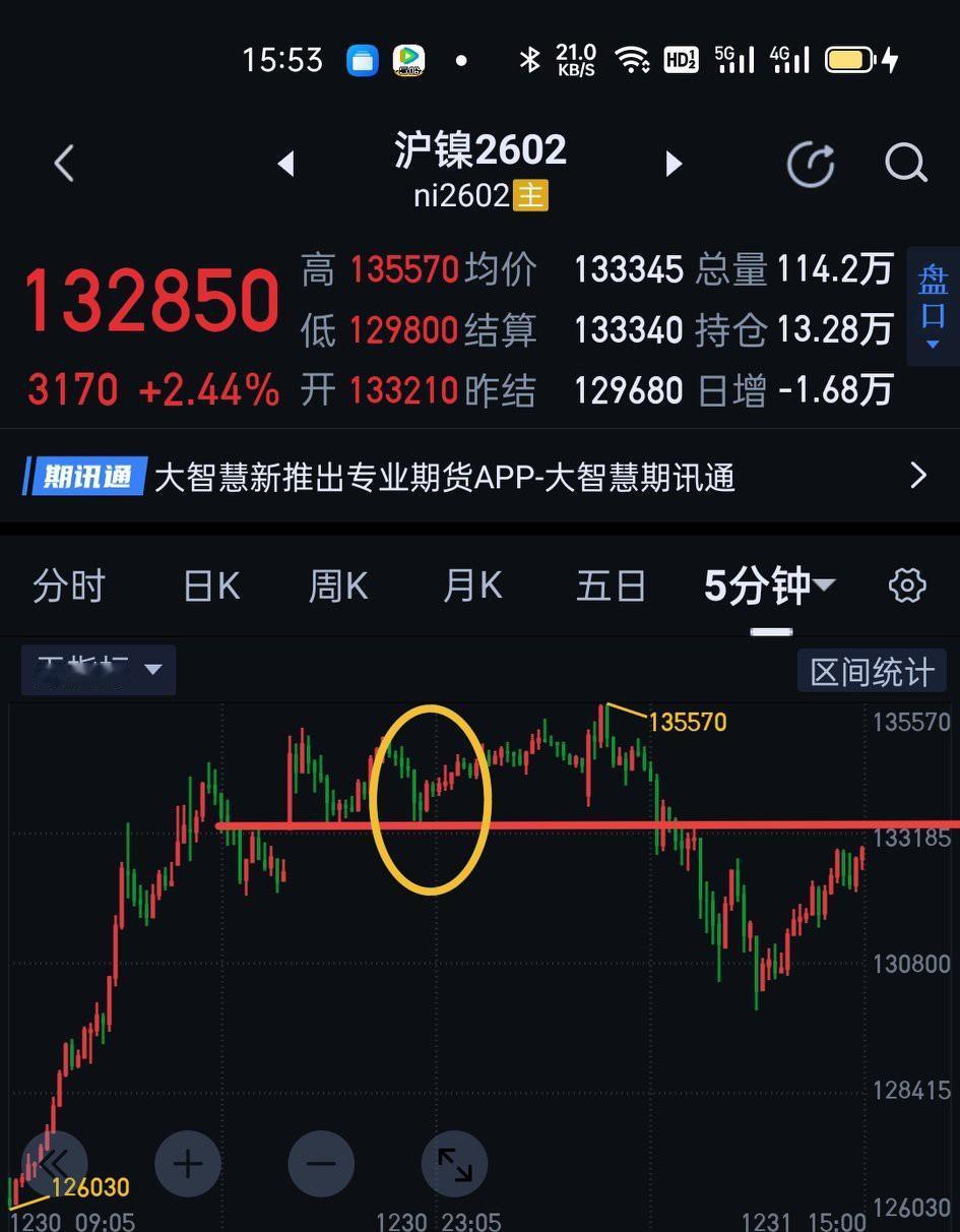 沪镍商品期货,目前处于5分钟一笔上的生长中,夜盘如能在132030上方站稳,会继续了挑战133240的压力,如果顺利通过,要防止5分钟一笔上可能会止步于135570下方。如果132030不能站稳,走势仍会向前面5分钟中枢去寻找支撑。