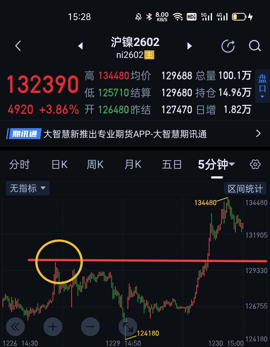 沪镍商品期货,目前仍是日线一笔上的生长中。更小结构是围绕五分钟中枢的离开段,该离开段目前还未呈现结束特征,夜盘可观察五分钟一笔下的回调能否在129820上方企稳,如能站稳仍可期待新高。否则仍有回到中枢震荡的可能。