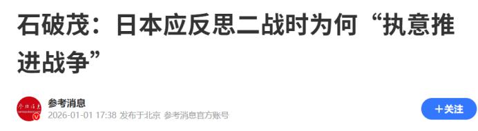 石破茂认知深刻!2026年1月1日报道,石破茂透露23年前与李光耀的一次谈话记录,试图“点醒”日本民众!   日本首相在公然发表涉台言论后,中日关系急转恶化。对此,我国发布了多则警告,督促日方进行悔改。   但日本方面不仅没有悔改之意,反而在扩大军事防卫。日本的此举引起了国际的高度关注,国际普遍认为日本的军国主义思想,在逐渐的死灰复燃。   当国际讨论热度越来越大的时候,日本国内的争议也没有平息。日本国内不少政界人士以及各领域的知名人士纷纷对此表达了强烈的不满以及反抗。其中日本前首相石破茂更是多次针对此事发言,试图“点醒”日本民众。   根据媒体2026年1月1日的报道,石破茂在接受日本媒体采访的时候,就提到了23年前与李光耀的一次谈话。据石破茂表示,当时李光耀就问他是否知道日本在战争期间,对新加坡做了什么?   当时的石破茂按照日本教科书上面的说法作答,但李光耀却表示,如果他只知道那些,未来新加坡同日本很难再维持信任关系。   李光耀的这个说法进一步的证明了,日本政府毫无悔过之意所以在篡改日本教科书,试图掩盖或者淡化过去的罪行。   而在时隔23年之后,石破茂提及这件事情,意图更是非常的明显。当下的日本需要正确的面对历史,对于当初的战争罪行应有反思之意,而不是执迷不悟。   在提到这件事情的时候,石破茂总结,如果不了解过去的历史,就很难去维持长久的信任关系。对此,您怎么看?欢迎评论区留言您的看法,我们一起讨论一下。 (信息来源:石破茂:日本应反思二战时为何“执意推进战争”-参考消息)
