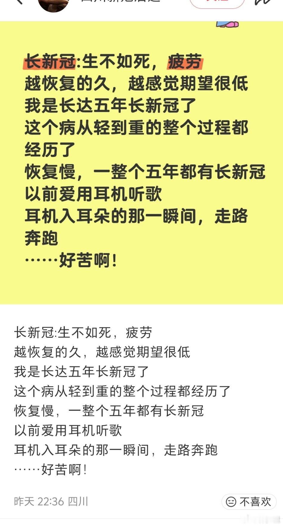长新冠患者的脑雾。主页写着长新冠恢复第二年,帖子里写五年,都记乱了。