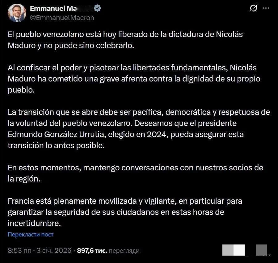 法国总统的双标。马克龙最近有点忙,一边操心委内瑞拉的“家务事”,一边还得护着法国的“自家门”。在1月3日委内瑞拉总统被美抓获后,他公开提议委内瑞拉应由反对派人士埃德蒙多·冈萨雷斯·乌鲁蒂亚暂代元首职务,并和英国首相斯塔默一唱一和,将马杜罗的下台称为“值得高兴”的事,急切呼吁推进“和平民主的过渡”。这番指点江山的热情,让人几乎忘了他刚在2024年12月31日的新年致辞中郑重强调:法国将尽一切努力确保本国总统选举“尽可能平静地进行,尤其是不受任何外国干预”。 这前后脚的表态,构成了一幅耐人寻味的画面。一边坚决反对外部势力触碰自家的民主流程,另一边却对他国的政权更迭主动设计路线、提名代理者,其中的双重标准可谓赤裸裸。国际社会公认的准则是不干涉内政,这并非一句空话,它意味着尊重各国人民自主选择发展道路的权利。用“民主”包装的政权颠覆倡议,本质上仍是强权政治的旧剧本,只不过台词换成了“自由选举”和“人民意愿”。当大国热衷于按照自身喜好为他国指定过渡方案时,真正的民主精神往往已被抛在脑后。世界需要的不是居高临下的“教师爷”,而是平等相待、互相尊重的对话者。毕竟,谁家的院子都不喜欢外人闯进来指手画脚,这个道理,放之四海而皆准。