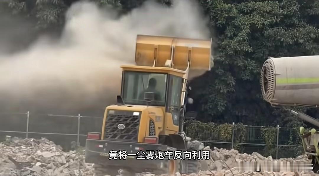 广州海珠区一工地拆迁本是用来除尘的雾炮车,被反向操作,对着居民区和商铺一个劲吹风
