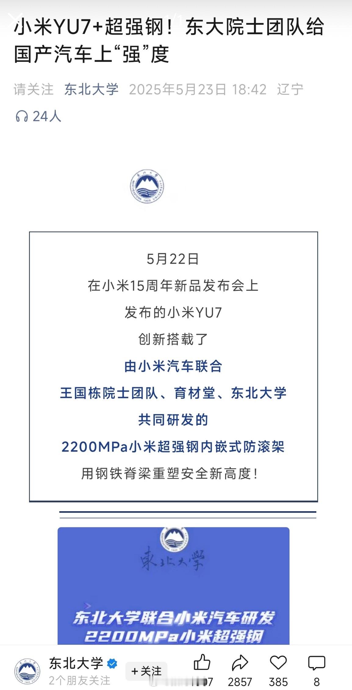 小米超强钢这些人只会扣小字说是项目名,却看不到2200Mpa,很简单既然是认为是项目名,小米YU7也发布这么久了,去测一测不都知道了,一边不敢测,一边扣帽子,就是你小米不对。