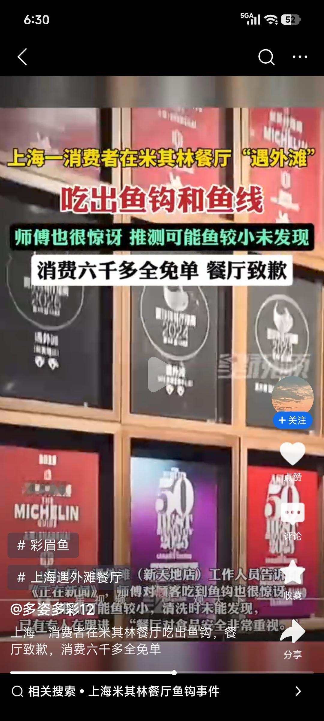 上海“遇外滩”这事儿真够闹心的。消费者在米其林餐厅花6000多元吃“老菜脯蒸彩眉鱼”,竟吃出鱼钩和鱼线。餐厅虽免单还道歉,说鱼小清洗没发现,但谁能信啊? 这可是米其林一星、黑珍珠二钻的高端餐厅,人均839元呢,连基本的食品安全都保证不了。而且,米其林餐厅食品安全问题不是个例,上海另一家米其林三星餐厅也曾用过期食材,导致顾客食物中毒。关键是米其林评审还不看食品安全,只看口味。这样下去,消费者的信任迟早被消费光!