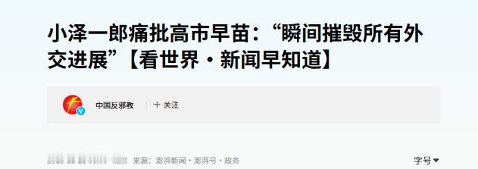 小泽一郎痛批高市早苗!2025年12月22日,小泽一郎批评高市“火上浇油”后,与日本议员聚会时,再谈高市早苗! 当日本首相高市早苗发表错误的社团言论,促使中日关系恶化后,日本国内的多名议员纷纷提出了抗议。其中就包括日本议员小泽一郎,小泽一郎是立宪民主党籍的众议员。在中日争端发生后,他就多次痛批高市早苗。 例如在11月份的时候,就直接指出高市早苗的行为“瞬间摧毁了所有的外交进展”。以此来表达自己对她外交政策的批评,除了这一点之外,在2025年12月22日的时候,据媒体报道,他再度批评高市早苗。 指出日本议员去访问台湾这件事情,就是在火上浇油,让局势雪上加霜,并反问高市早苗是否还有正常的判断力。 他的言论引起了极大讨论,他的这一言论带来的热度还未平息的时候。据媒体报道,在1月1日的时候,日本有80多位的议员在他的家中聚会。 聚会期间,他再度针对高市早苗的行为发言。毫不避讳的指出,中日关系恶化是2026年日本最大的考验。所以必须要给高市早苗压力,以此避免他们失去存在的价值。为了能够实现施压的目的,他更是从多方面去进行了举例。 日本境内除了小泽一郎这名议员提出反对看法之外,还有日本的多位前首相更是对高市早苗的言论大力批评。 不难看出当下的高市早苗,已经在日本境内引起了强烈的不满。而这只能说自作自受,从一开始中国就三令五申,不允许任何外部势力干涉中国内政问题,但她却试图挑衅。 对此,您怎么看?欢迎评论区留言,您的看法,我们一起讨论一下。 (信息来源:小泽一郎抨击高市“火上浇油”-参考消息) (信息来源:小泽一郎痛批高市早苗:“瞬间摧毁所有外交进展”【看世界·新闻早知道】-澎湃新闻) 【免责声明】:文中部分观点仅为个人看法,请理性阅读。