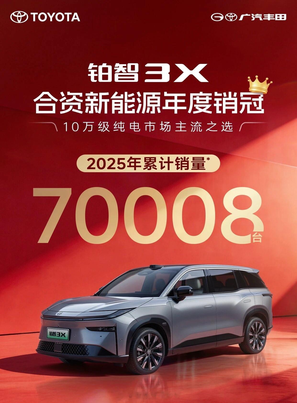 刚刷到广汽丰田2025年销量数据,全年772668辆同比正增长,在车市竞争这么卷的情况下还能稳住涨势,确实有点东西。其中最亮眼的当属铂智3X,全年卖了70008台,直接拿下合资新能源年度销冠!要知道10-15万级纯电SUV市场可是神仙打架,铂智能站稳脚跟还冲顶第一,除了产品力能打,行业首创的厂家三担责政策绝对是加分项——电池自燃、智能泊车辅助事故、电池衰减都敢担责,这波保障直接戳中用户痛点,也难怪能收获这么高的市场认可度。合资新能源的发力,你怎么看?广汽丰田2025年销量超77万辆2025年铂智3X全年销量70008台