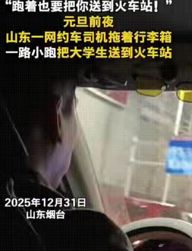 被狠狠拿捏了!山东烟台,跨年夜,女生拿着大箱子打了辆网约车要赶火车,没想到车站附近的路都堵车,女生看着堵的纹丝不动的车队,顿时觉得自己可能要在车站跨年了。 没想到师傅直接来了句:“姑娘你放心,跑着我也要把你送到火车站!” 女生原以为这就是司机大哥的一句玩笑话。 车窗外的霓虹灯晃得人眼晕,女生攥着手机的手指都泛白了——还有45分钟检票,前面的车队却像被按下了暂停键,连挪一米都难。 她刚毕业工作第一年,满心盼着赶回老家和父母吃顿跨年饺子,票是抢了半个月才到手的,要是错过了,就得在出租屋里孤零零守岁。正急得眼圈发红,就见司机师傅猛地拉上手刹,转身从驾驶座底下拽出一副薄薄的手套戴上。 “愣着干啥?”师傅声音洪亮,带着山东人特有的实在,“这条巷子里能抄近路,步行15分钟就能到进站口,再晚就真赶不上了!” 女生还没反应过来,师傅已经绕到后备箱,单手扛起那个装着羽绒服和特产的大箱子。箱子看着就沉,师傅腰弯了一下才稳住,肩背绷得紧紧的。 “我来吧师傅,太沉了!”女生赶紧上前,却被师傅摆手拦住。“你穿得少,跟着我快走就行,别冻着。”说话间,师傅已经迈开步子往路边的小巷子里钻。 女生这才看清,师傅鬓角有不少白发,袖口磨得发亮,手套指尖都破了洞,寒风一吹,他的耳朵冻得通红。 后来聊天才知道,师傅姓王,今年52岁,开网约车五年了,儿子和这女生差不多大,去年跨年也是赶火车回家,遇上堵车差点误了车,打电话哭着跟他说想家的样子,他至今记得。 “出门在外都不容易,能帮一把是一把。”王师傅脚步没停,呼吸都有些急促,却还不忘安慰女生,“这条道我熟,以前拉货的时候经常走,岔路少,比绕主干道快多了。” 巷子不宽,路灯昏黄,地上还有没化净的积雪,走起来有些打滑。王师傅拎着箱子的胳膊一直绷着,每一步都踩得很稳,偶尔遇到结冰的路面,他会先站稳,再回头示意女生慢点走。 女生想替他拎一会儿,他总说“快到了”“不沉”,可女生分明看到,他的手背青筋暴起,额头上渗出的汗珠顺着脸颊往下淌,把衣领都浸湿了。 走到巷子口的时候,正好遇上巡逻的交警小李。小李见两人气喘吁吁,王师傅还扛着个大箱子,赶紧上前询问。 得知情况后,小李二话不说,让女生坐上巡逻摩托,自己接过王师傅手里的箱子,“我送你们一段,前面到进站口还有段距离,骑车快!”摩托引擎轰鸣着穿过人群,寒风刮在脸上生疼,女生却觉得心里暖烘烘的,看着前面小李挺拔的背影和王师傅紧随其后的脚步,眼眶一下子就湿了。 检票口即将关闭的提示音响起时,女生刚好冲到门口。回头望去,王师傅正扶着膝盖喘气,手套扔在一旁,双手冻得通红,却对着她咧嘴笑:“快进去吧,别耽误上车!” 女生想转钱感谢,王师傅却摆了摆手,转身就往回走,身影很快消失在人群里。她甚至没来得及问清师傅的全名,只记得车牌号末尾是“鲁F·3279”。 后来女生在火车上刷到本地新闻,才知道2025年跨年夜烟台火车站单日发送旅客超3.2万人次,周边海港路、北马路等三条主干道拥堵时长超45分钟,不少网友都在吐槽“跨年堵在去火车站的路上”。而她,成了那个最幸运的人。 有人说现在的人都只想着赚钱,可王师傅和小李的举动却让我们看到,善意从来都没有缺席。 网约车师傅的一句承诺,交警的主动援手,没有惊天动地的壮举,却在寒冷的跨年夜里,给陌生人带来了最实在的温暖。他们或许只是普通人,做着平凡的工作,却用自己的行动,诠释了什么是“举手之劳暖人心”。 在这个快节奏的时代,我们总在为生活奔波,却常常忽略了这些藏在细节里的善意。可正是这些不期而遇的温暖,让我们在陌生的城市里不再孤单,让奔波的旅途多了一份感动。 各位读者你们怎么看?欢迎在评论区讨论。