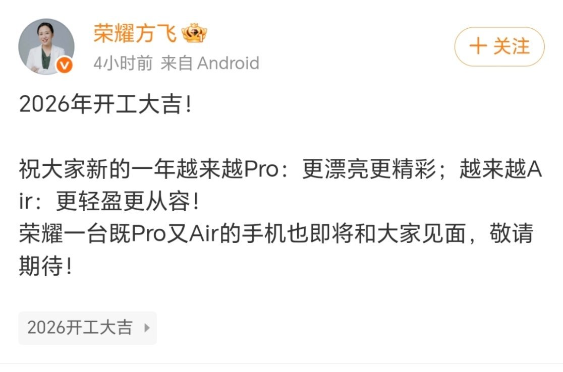 方飞的微博,拉开了2026手机大战的序幕。今年开局的关键词是“差异化”。当其他品牌在卷电池容量、卷像素时,荣耀似乎想开辟一条新赛道:在顶尖的硬件性能(Pro)与极致的工业设计(Air)之间找到完美结合点。这或许比单纯的参数堆砌更难,但也更能定义下一代旗舰的样子。