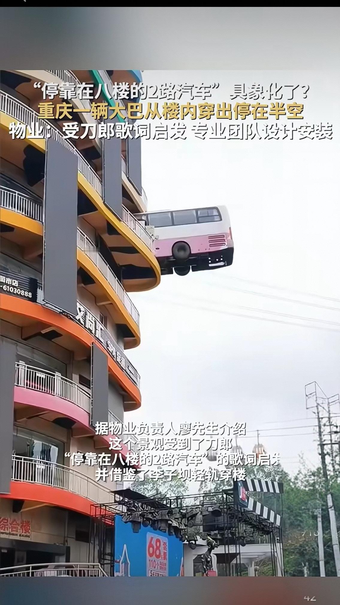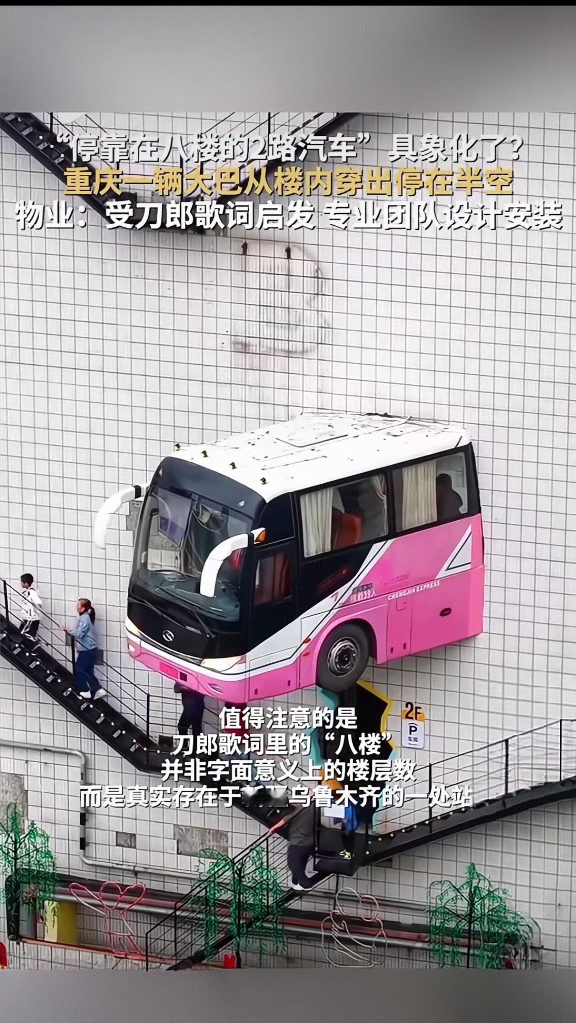 重庆“八楼大巴”穿楼爆火!是创意致敬还是流量狂欢? “停靠在八楼的二路汽车,带走了最后一片飘落的黄叶”,刀郎这句传唱20年的歌词,如今在重庆变成了触手可及的景观——一辆大巴车半截穿出楼宇、悬停半空,乍一看竟真如歌词照进现实。物业直言灵感源自这首经典歌曲,还借鉴了李子坝轻轨穿楼的网红基因,专业团队设计安装的说法,却没能挡住网友的热议狂潮。 很少有人知道,歌词里的“八楼”从不是真的楼层,而是乌鲁木齐昆仑宾馆的专属代号。1958年,八层楼高的昆仑宾馆成为当地第一高楼,百姓顺口叫它“八楼”,门口的公交站也随之更名 。1939年开行的2路公交,沿着这条贯穿城市南北的“黄金线路”跑了半个多世纪,高峰时3分钟一班,车厢里的烟火气藏着几代乌鲁木齐人的青春记忆。2002年的一场雪,让刀郎在站台灵感迸发,也让这处站点成了刻在国人记忆里的文化符号,即便2011年线路停运,“八楼站”站牌仍被永久保留。更让人动容的是,2025年4月,复古涂装的2路公交重启,串联起新疆国际大巴扎、红山公园等景点,让歌词里的情怀真真切切延续下来。 可重庆这处“具象化”景观,却让这份情怀变了味。有网友吐槽“强行蹭热度”,毕竟歌词里的温情与城市记忆,哪是凿墙焊车就能复刻的?更核心的争议在安全——几吨重的钢铁车身挂在墙体,风吹日晒会不会松动?楼体承重是否真的达标?此前网红打卡点坍塌、溺水的事故教训犹在眼前,物业一句“安全没问题”,终究抵不过公众对专业数据和审批文件的渴求 。更尴尬的是监管模糊,住建、城管、消防谁来主管都没明确说法,这种“先造景再核查”的模式,难免让人捏把汗。 其实网红地标从来不缺创意,乌鲁木齐的2路公交专线,靠的是还原历史、延续情感成为爆款;重庆李子坝的成功,源于功能与景观的自然融合。真正的爆款,从来不是生硬捆绑流量,而是让创意扎根文化、守住安全底线。 你觉得重庆这处“八楼大巴”是创意还是隐患?如果去乌鲁木齐,你会打卡重启的2路公交吗?快来评论区聊聊你的看法!景点穿楼轻轨