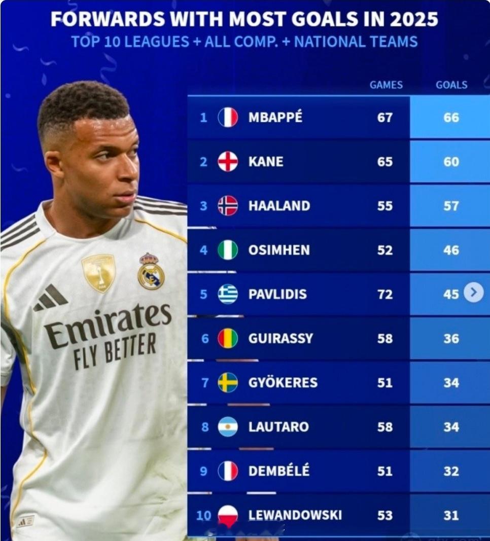 德转2025前锋进球榜:姆巴佩67场66球登顶 新绝代双骄领跑德国转会市场网站盘点2025年俱乐部+国家队各项赛事前锋进球榜,十位世界级射手入围前十,进球数均突破31球、出场次数不少于51场,尽显顶级前锋的稳定输出能力。其中皇马球星姆巴佩以67场66球的统治级表现独占鳌头,凯恩、哈兰德紧随其后,勾勒出梅罗之后足坛的进攻新格局。榜单呈现清晰的梯度分布:姆巴佩与凯恩是仅有的两位进球破60球的球员,前者多赛2场领先6球,展现绝对竞争力;哈兰德以55场57球成为唯一突破50球的球员,场均超1球的效率堪称恐怖;奥斯梅恩、帕夫利季斯携手迈入40球俱乐部;吉拉西、约克雷斯、劳塔罗、登贝莱、莱万多夫斯基五位球员则稳定贡献30+进球,构成顶级射手的中坚力量。值得一提的是,姆巴佩的66球中包含皇马俱乐部59球与法国国家队7球,追平C罗保持的皇马自然年队史纪录,射门命中门框范围后50%的转化率尽显高效。2025年各项赛事前锋进球TOP10(俱乐部+国家队)1. 姆巴佩(皇家马德里/法国队):67场66球2. 凯恩(拜仁慕尼黑/英格兰队):65场60球3. 哈兰德(曼城/挪威队):55场57球4. 奥斯梅恩:52场46球5. 帕夫利季斯:72场45球(出场次数最多)6. 吉拉西(多特蒙德):58场36球7. 约克雷斯(葡萄牙体育/阿森纳):51场34球8. 劳塔罗(国际米兰):58场34球9. 登贝莱(巴黎圣日耳曼):51场32球10. 莱万多夫斯基(巴塞罗那):53场31球