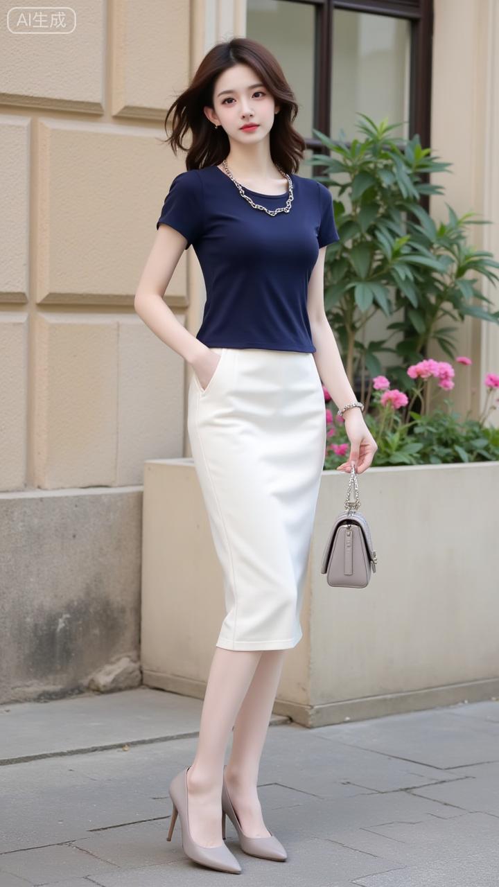通勤穿搭的优雅模板 藏青T恤搭奶白半裙,简约里透着精致,项链和浅包衬得气质刚好。日常通勤这么穿,舒服又养眼藏青色衬衫穿搭 藏青色系穿搭 藏青系穿搭