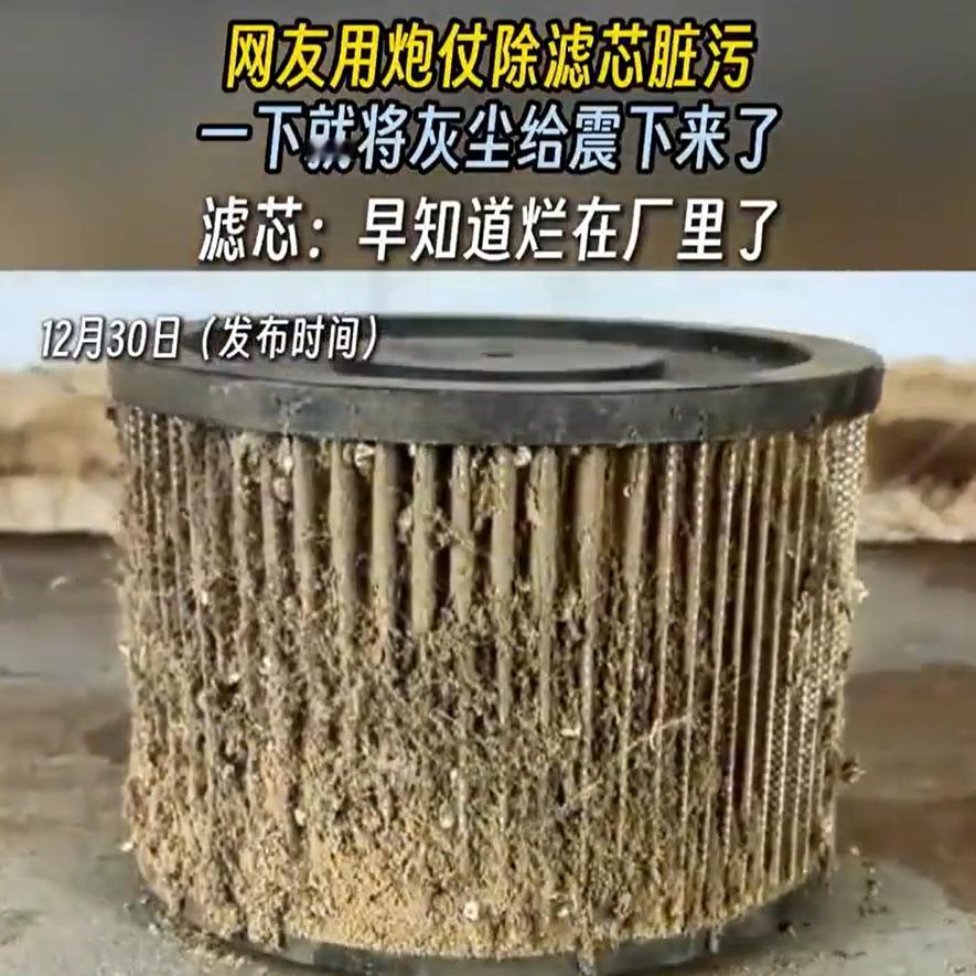 昨天刷手机,看到个视频真是绝了。一哥们儿家滤芯脏得不行,吹也吹不干净,刷又累,他居然拿了个小鞭炮,塞进木头块里点着,然后把滤芯倒扣上去。就听“砰”一声闷响,再拿起来一看,灰尘直接掉了大半,滤芯都露出来。 这办法原理其实挺简单。鞭炮在密闭下炸开,冲击波往四周冲,灰尘扛不住就全给震下来了。比用嘴吹强多了。有人还说,该用二踢脚,一响上天,二响清灰。 网上挺多人点赞,说这才是民间智慧,比啥洗洁精都管用。可也真有人试完发现滤芯炸坏了,甚至有安全隐患。高温和压力太大,滤芯材料根本吃不住。 说白了,这法子看着爽,但真不是谁都能上手。家用还是老老实实吸尘或水洗更靠谱。毕竟谁也不想为了清个灰,把东西弄坏还惹出事。
