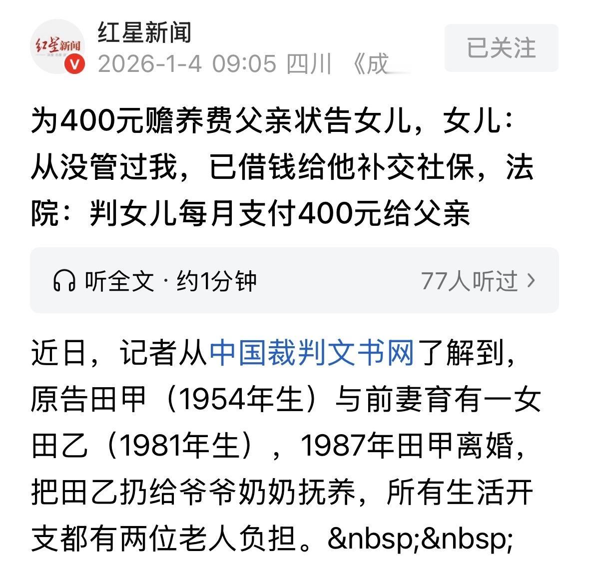 湖北武汉,女子打小被父亲扔给爷爷奶奶养,父亲30年间对她不闻不问,一分钱都没给过,连她结婚也没露面,直到退休拿不出钱补缴社保和医保,才想起有个闺女,女子因失业日子过得捉襟见肘,却还是东拼西凑35000块给了父亲,让他如今每月能拿到1500的退休金,然而,父亲又要求女子每月再给他400赡养费,可女子有孩子要养,婆婆病重也正需要钱,实在拿不出钱了,只好拒绝,父亲因此闹上法院,最终判决出乎意料。网友:先追回18岁以前的抚养费,再谈养老费! 2025年3月的一天,田女士收到一张法院传票。 告状她的不是别人,正是她那个30多年没怎么管过她的亲爹,老田。 老田是1954年生的人,到了1987年,他跟媳妇离婚,那时候田女士才6岁。 一般人离婚都怕亏着孩子,老田倒好,直接当了甩手掌柜,把女儿往爷爷奶奶家一扔,拍屁股走人。 从那以后,田女士的一针一线、学费杂费,全是两个老人掏腰包,父亲老田一分钱没出过,连个面都很少露。 田女士命苦但争气。中专毕业后,她没靠家里,一边打零工一边读完成教专科。 那时候日子过得特别苦,她硬是咬牙挺过来了。 工作后,她想着爷爷奶奶恩情重,自己省吃俭用也要孝敬老人。 后来她结婚,父亲依旧没现身,仿佛这个女儿是空气。 到了2014年,田女士没了正式工作,只能到处打零工,挣点辛苦钱。家里还有个上初中的儿子,正是花钱的时候。 更难的是,她婆婆得了双肾衰竭,天天靠药吊着命,全家就靠丈夫一个人的工资撑着四口人的开销,日子过得那是相当紧巴,恨不得一分钱掰成两半花。 反观老田,2001年就再婚了,日子过得挺滋润。到了2019年,老田快退休了,却拿不出钱补缴社保和医保。 这时候,他想起了那个被他不闻不问了30年的女儿。 田女士心软,也是为了让父亲老了有个保障,东拼西凑借了35000块钱,给老田把手续补齐了。 靠着这笔钱,老田现在每个月能领1500块养老金。后来他生病,闺女田女士又陆陆续续给了3000块看病钱。 在田女士看来,自己尽到了心意,虽然爹没养过自己,但血浓于水,能帮就帮。 可她万万没想到,2025年3月,父亲老田居然把她告上了法庭。 老田在法庭上倒是理直气壮,说我退休金就1500块,我现在的老伴没工作,我们俩身体都不好,这点钱根本不够花!我要求女儿每月给我400块赡养费。 田女士听完心都凉了半截。她在庭上倒苦水,说我不是不想养你。可我现在自己都快活不下去了,打零工收入不稳定,上面有婆婆要治病,下面有儿子要上学,全家指望我老公一个人。我没闲钱了! 那么,从法律角度怎么看? 《民法典》第1067条第1款规定:成年子女不履行赡养义务的,缺乏劳动能力或者生活困难的父母,有要求成年子女给付赡养费的权利。 法律规定赡养是成年子女的法定义务,这种义务通常不以父母是否尽了抚养义务为前提, 老田虽然在田女士幼年时将其遗弃给祖父母,未支付抚养费,甚至在女儿结婚、失业困难时期缺席,但在法律层面,二人血缘关系并未切断。 老田年轻时的“不作为”在道德上应受谴责,甚至田女士可以主张追索当年的抚养费,但这不能直接作为她现在拒绝赡养的合法抗辩理由。 只要老田符合“缺乏劳动能力或生活困难”的条件,田女士就有给付义务。这并非指父母必须穷困潦倒,而是指收入不足以维持当地基本生活水平。 法官认为,老田虽然只有1500元退休金,生活不算宽裕,但他并没有拿出证据证明自己完全没收入或者丧失劳动能力。 而根据2024年当地居民人均可支配收入来算,每个月400块钱的标准,其实还在普通老百姓能承受的范围内,不算“狮子大开口”。 最后,法院一审判决:田女士必须每月支付老田赡养费400元。 虽然法律支持赡养费请求,但法院并未盲目支持高额诉求。法官审查了老田的收入与当地人均可支配收入的对比,认为400元在田女士的承受范围内。 如果田甲有高额退休金却索要高额赡养费,法院很可能会驳回或大幅降低数额。 有人觉得老田太无情,年轻时不养小,老了反倒来“吸血”。 但也有人觉得,从法律上讲,子女赡养父母是义务,不能因为父母以前没管过自己就彻底不管,毕竟老田现在确实老了,且田女士也确实出钱帮他办了退休,说明有一定经济往来。 法律不支持“父慈子才孝”的对等交换逻辑,子女不能以“父母未抚养”为由彻底甩手,这是对老年人基本生存权的保障。 但同时,法律也不支持“杀鸡取卵”式的赡养,必须考虑子女的实际负担能力。 对此,你怎么看? 关注@运良说法 学法律知识不迷路