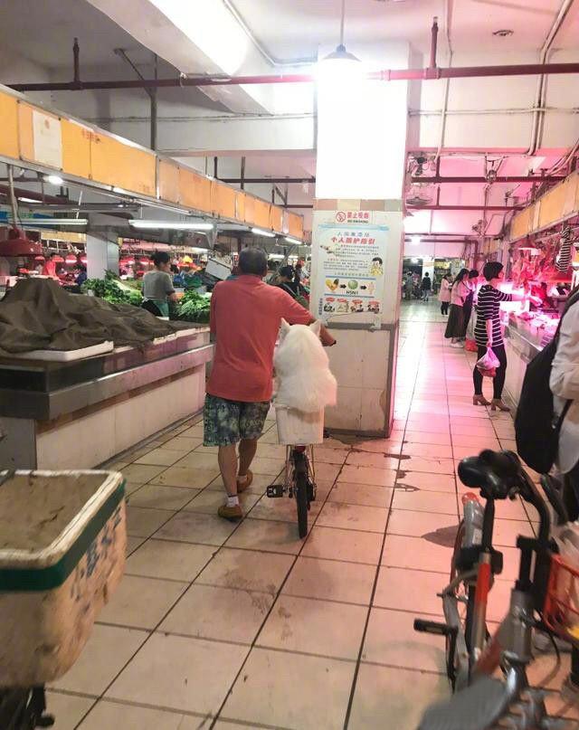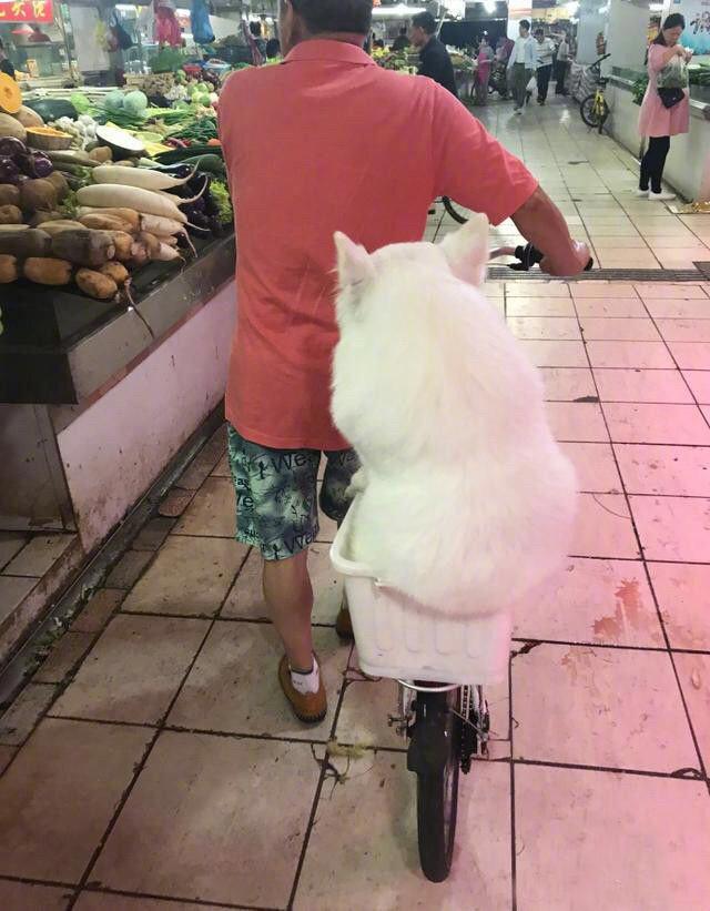 逛菜市怕弄脏萨摩,直接塞它进篮子!哈哈哈哈一坨好乖啊