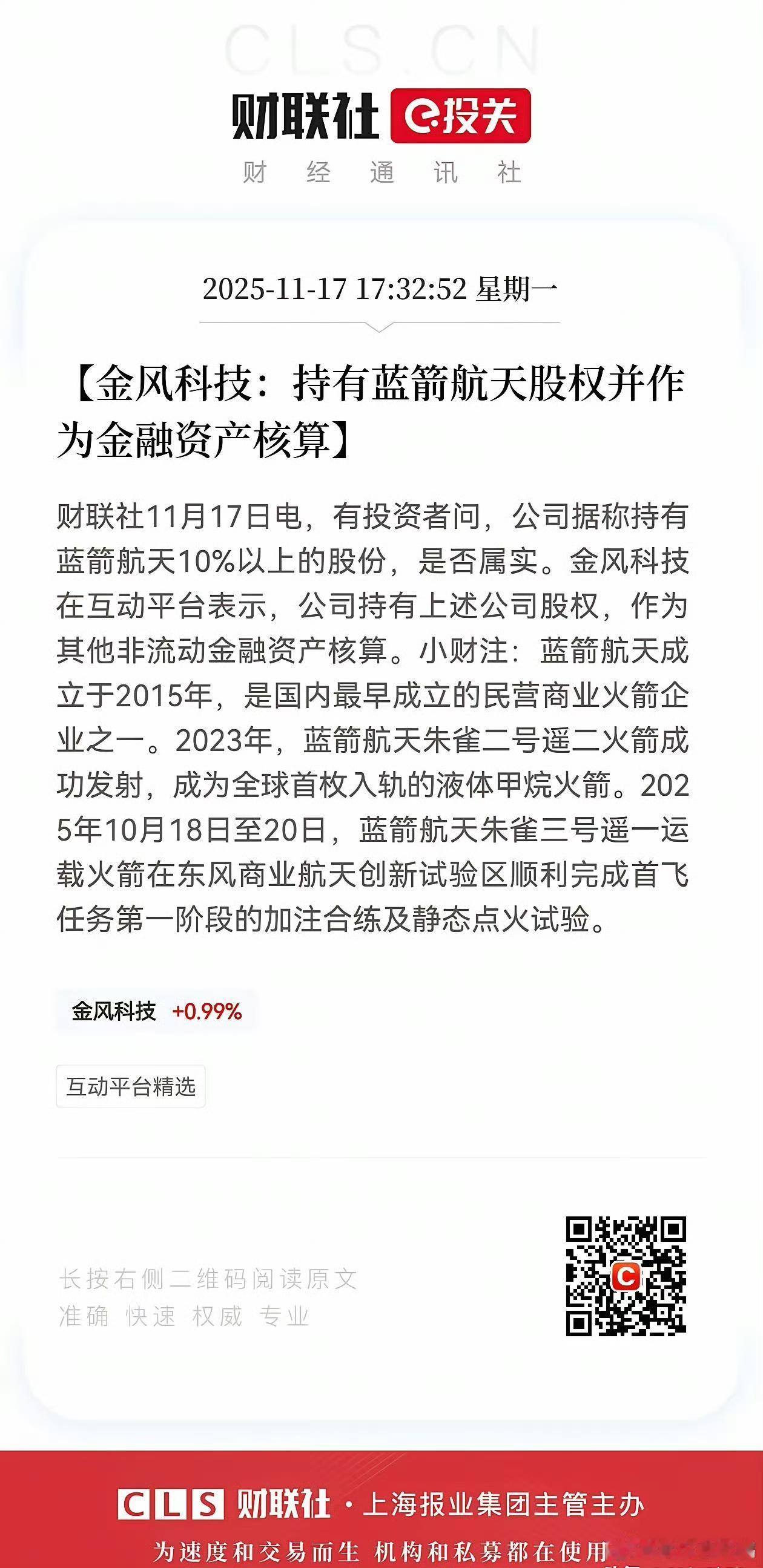 持有蓝箭航天股份超10%,股价竟不如只持有0.89%的鲁信创投。 相信前几天持有金风科技的股民有点郁闷,蓝箭航天科创板IPO已受理,大股东金风科技涨得不多跌得快,而仅持有蓝箭航天0.89%股份的鲁信创投不仅4连板,而且短暂回调后,31号又封板了。 怎么看金风科技都应该更强势点,持有金风科技的股民还没处说理去!
