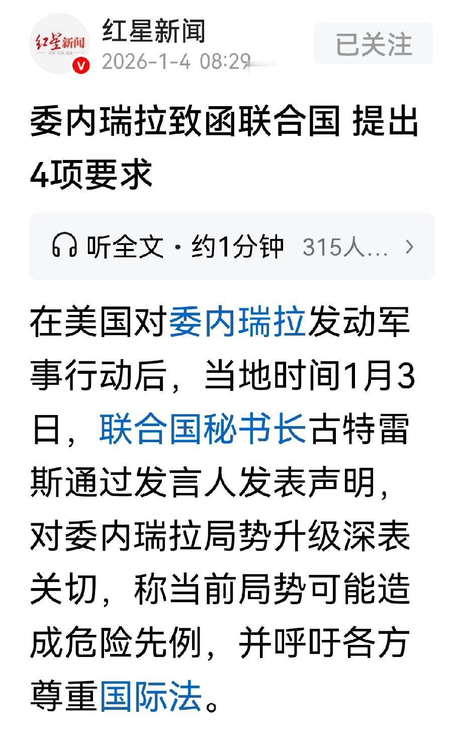 这次讨论委总统被抓捕的联合国安理会其轮值主席国竟然是索马里,不知索马里的态度坚不坚决?胆量如何? 索马里这段时间的日子也不好过,以色列于12月26号承认了索马里兰的独立身份,索马里政府正在为此事在国际社会上寻求支持,并谴责以色列违反《联合国宪章》的行为。 1月5号的联合国安理会大会上,估计美国抓捕委总统马杜罗与以色列承认索马里兰会一并进行讨论。 2026年的开局非比寻常,联合国安理会第一次会议讨论的竟然是国际法与《联合国宪章》,而违反这个宪章的竟然是横行全球的美国与横行中东的以色列二霸。 期待1月5号的成果,看哪一方被怼得哑口无言!