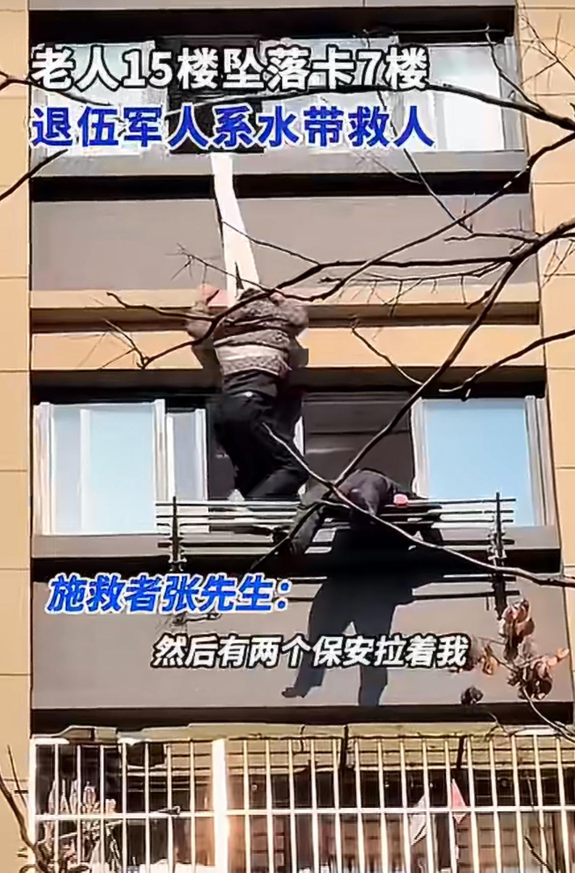 “终于有身手矫健的保安了!”七旬老人15楼坠落卡7楼晾衣架,生死悬于一线!千钧一发之际保安系消防水带冒险施救,是勇敢无畏还是过于冒险? 1月4日一则令人揪心又暖心的视频在社交平台疯传,江苏南京某小区里一位老人不慎从15楼坠落,身体竟卡在了7楼窗外的晾衣架上命悬一线!这惊险的一幕让无数网友的心都提到了嗓子眼。 当天小区里突然炸开了锅。有居民发现一位年约七八十岁的老人不知怎么从15楼坠落,整个人悬挂在7楼窗外,仅靠那细细的晾衣架支撑着。老人的身体摇摇欲坠随时都有再次坠落的危险,情况万分危急。居民们吓得脸色苍白,一边大声呼救一边赶紧拨打急救电话。 就在这千钧一发之际,小区保安队长张先生接到了居民的求助消息。他心里立刻意识到事情的严重性,来不及多想拔腿就往现场跑去。一路上他的脑海里只有一个念头:一定要快点,再快点,救下老人! 当张先生气喘吁吁地赶到现场时,眼前的景象让他倒吸一口凉气。老人已经完全悬挂在7楼窗外,身体在风中晃晃悠悠,他赶紧查看情况,发现7楼住户家里没人而6楼窗外还装有防盗窗,根本无法攀爬过去施救。这可怎么办?时间一分一秒地过去,老人的生命在一点点流逝,张先生的心也跟着揪得紧紧的。 就在这时8楼的业主及时打开了门,为施救提供了宝贵的空间。张先生急中生智立刻从消防栓里取出消防水带,紧紧地绑在自己的腰间。其他保安和8楼业主见状,也纷纷上前帮忙紧紧拉住水带的另一端,给张先生提供支撑。 张先生深吸一口气,小心翼翼地从8楼窗外缓缓下移。每移动一步他都感觉自己的心跳在加速,终于他成功下移到了7楼靠近了老人。此时老人虽然意识尚清醒,但已经被吓得脸色苍白,眼神中充满了恐惧和无助。张先生一边轻声安慰老人:“大爷,别怕,我来救您了!”一边小心翼翼地将老人从晾衣架上解救下来,然后紧紧地抱住老人,在其他人的协助下,将老人安全地救回了室内。 当老人被救回室内的那一刻,现场响起了热烈的掌声和欢呼声。居民们纷纷对张先生竖起了大拇指,称赞他是英雄。张先生却不好意思地笑了笑,说:“救人时根本来不及多想,满脑子都是尽快把老人救下来。作为一名退伍军人,我始终牢记‘退伍不褪色’的信念,坚信但行好事,莫问前程。” 这起事件在网上引起了广泛关注和热议。网友们纷纷为张先生的勇敢和无私点赞,称他是“最美保安”“平民英雄”。也有网友感慨:“在这个物欲横流的社会里,还能看到这样无私奉献、舍己救人的好人,真是太感动了!” 在我看来,张先生的行为不仅展现了他个人的勇敢和担当,更传递了一种正能量和温暖。他用自己的实际行动诠释了什么是真正的英雄,什么是人性的光辉。在这个快节奏、高压力的社会里,我们太需要这样温暖人心的故事了。它让我们相信在这个世界上,总有一些人愿意在关键时刻挺身而出,为了他人的生命安全不惜冒险。 让我们一起为张先生的英勇行为点赞、转发吧!让更多的人看到这份温暖和正能量。同时,也希望大家能关注身边的安全隐患,关爱身边的老人和弱势群体,让我们的社会变得更加美好、更加和谐。关注我,一起传递正能量,让爱洒满人间! (事件来源:点时新闻)