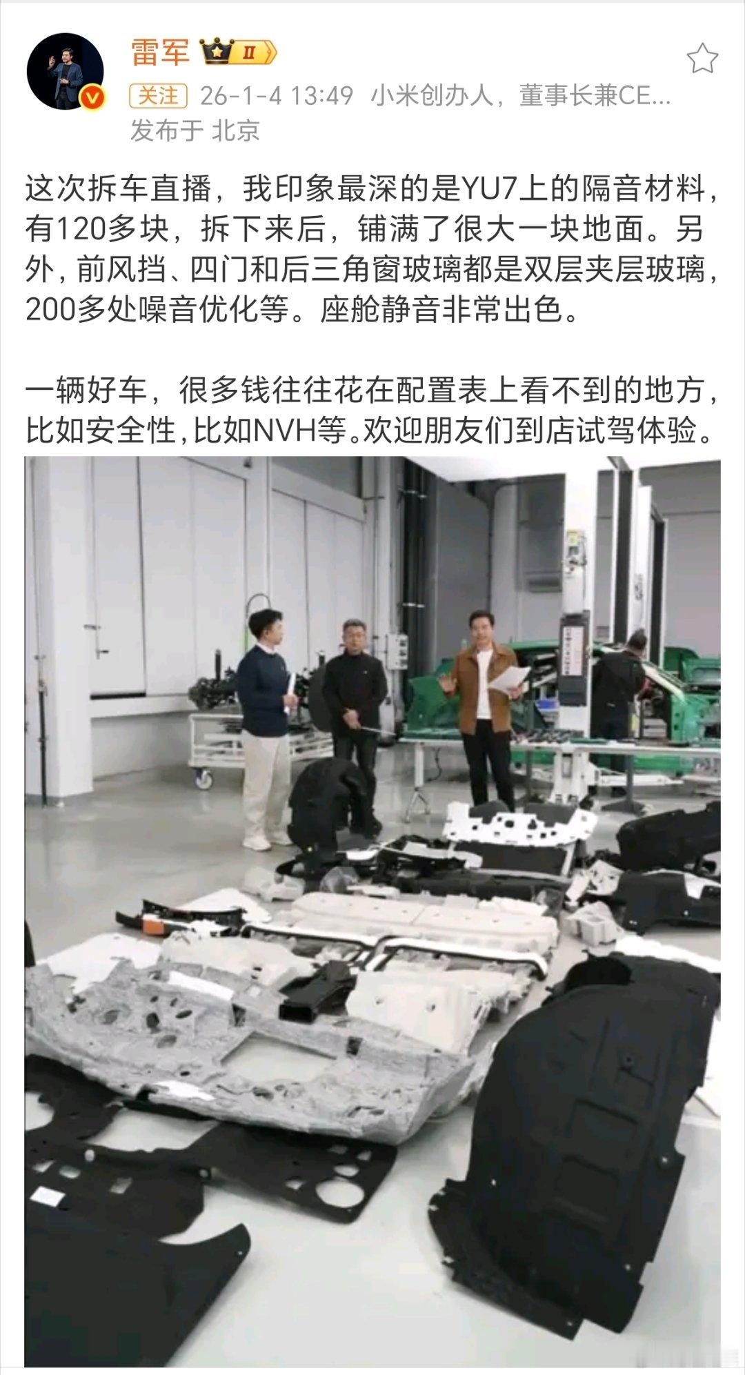 小米硬核拆车背后的产业坚守昨晚,雷总新年直播小米硬核拆车,引发了网络热议。雷总直播里把YU7拆了四五个小时,把超强钢、A/B柱内嵌防滚架、电池防护都展示给广大网友看,这是小米产业坚守的底气所在。面对网络上复杂的声音,小米坚持用产品和事实说话,这更体现了小米务实的态度和企业担当!