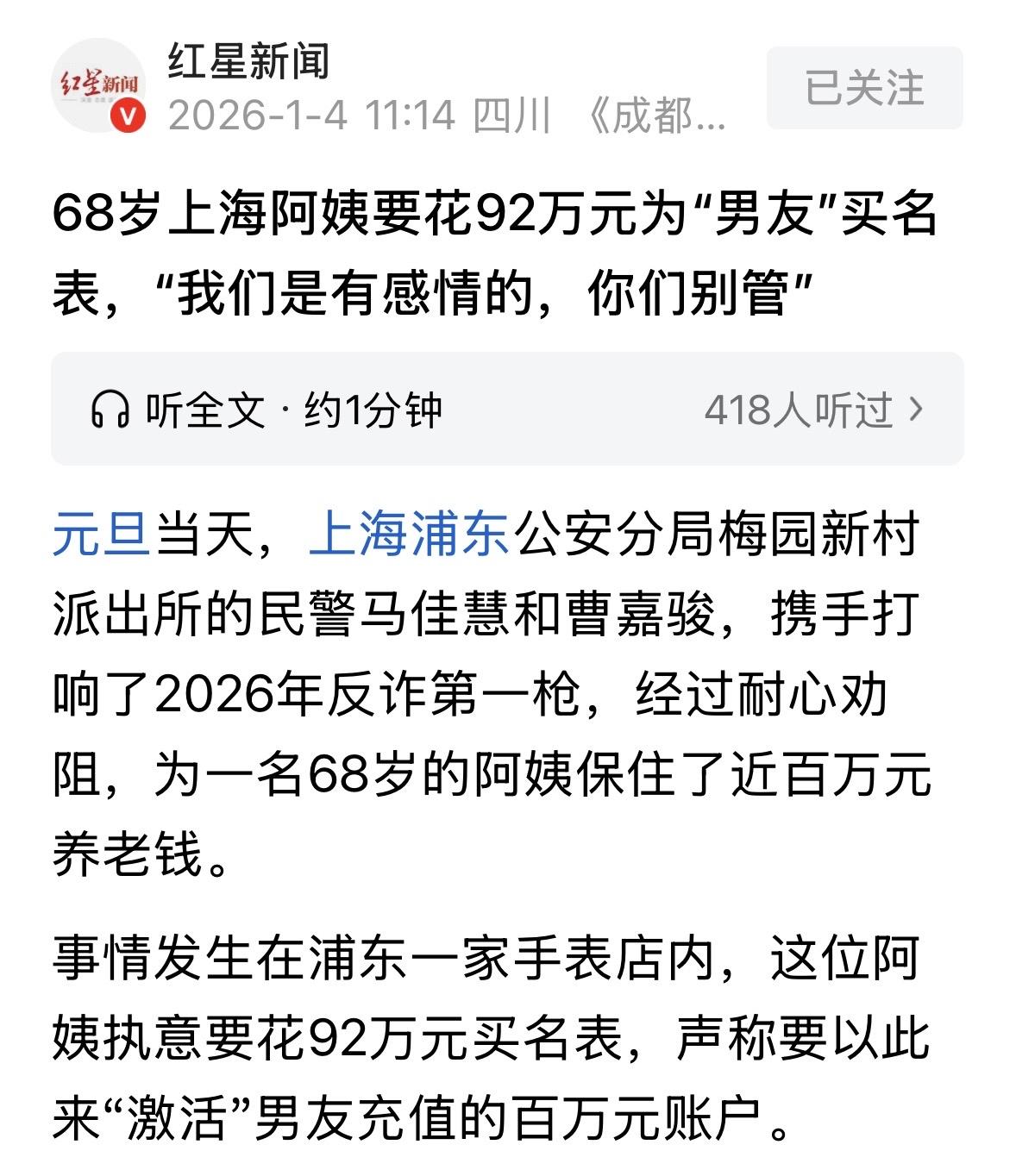 上海,68岁阿姨恋上一年轻小伙,对方自称是“兵哥哥”,不仅嘴甜,还有钱,说自己在某珠宝APP专门为阿姨充了100万以表心意,阿姨听后乐开了花,小伙却话锋一转,说系统原因没法提现,需要阿姨先买一块名表寄给他,阿姨听完想也没想,来到店里就要掏空家底拿下一块92万的表,民警前来阻止,阿姨大喊:我俩有感情,你们别管! 一家高档手表店里,柜台前站着一位上了年纪的阿姨。 她手指直直指向玻璃柜里一块表,张口就说:就这块92万的表,我要了,现在就刷卡! 92万,不是92块。哪怕是在寸土寸金的浦东,这可能也是一套房子的首付,或者是普通人打拼多年的积蓄。 店员不禁纳闷,这阿姨穿着朴素,神情却异常激动,一边准备付款,一边还在跟手机那头的人语音。 阿姨嘴里念叨着,说亲爱的你放心,钱我都准备好了,马上就能帮你把账户解冻了! 店员一听,敏锐察觉到不对劲,这事儿太反常了。买这么贵的表,不是为了戴,居然是为了什么解冻账户? 事出反常必有妖啊!店员立马警觉起来。这种套路,咋那么像杀猪盘呢? 店员没敢耽误,趁阿姨不注意,她立马报警,同时尽量拖延时间,不让阿姨把卡刷爆。 没想到,现实正如店员所料。这位阿姨早已陷入了一场精心编织的骗局中。 几个月前,她在刷短视频时,认识了一个自称是“现役军官”的男人。 这男人头像穿着军装,说话那是一个体贴入微,每天早安晚安哄着,把独居的阿姨哄得五迷三道,觉得这辈子终于遇到了知冷知热的依靠。 就在前两天,这位“兵哥哥”在网上抛出了诱饵。他说自己在某个珠宝投资APP里存了整整100万,准备以后跟阿姨过日子用。 但因为系统出了故障,这笔巨款暂时取不出来。 怎么办呢?这男友给出了一招,说只要阿姨去买一块价值92万的名表,快递寄给他,就能当作验证资金的媒介,把那100万的账户激活,钱就能提出来了。 为了让阿姨死心塌地掏钱,对方还画了个大饼,说事成之后,立马给阿姨转8万块钱的好处费。 阿姨一听,觉得这事儿靠谱。既能帮心上人解决困难,又能赚一笔,还能把那100万拿回来,简直是一箭三雕。 她根本没多想,甚至觉得这是一种伟大的付出,拿着自己的养老钱就冲进了表店。 然而,赶来的民警中止了她的交易,并在了解事情的来龙去脉后,一语点破这很可能是个骗局。 谁料,阿姨听后情绪瞬间激动起来,像护食的母鸡一样挡在柜台前,冲着民警喊:你们别管!我们是谈恋爱,是有真感情的!他是军人,不会骗我的!你们这是在破坏我们的姻缘! 阿姨这时候心里全是那个“兵哥哥”的好,觉得全世界都在阻碍她的幸福。 她甚至觉得民警是多管闲事,生怕耽误了给男友寄表的时间,导致那100万提不出来。 面对阿姨的抵触和谩骂,民警没有生气,也没有强行夺卡。他们知道,这时候硬来只会激起阿姨的逆反心理。 两人一左一右站在阿姨身边,像拉家常一样开始劝。 其中的曹民警翻出之前辖区里处理过的几个类似案例,一条条指给阿姨看,说您看这个,也是网上认识的所谓大老板,也是说账户冻结要买东西解冻,结果东西寄出去,人就拉黑了。 另一位马民警也在一旁劝说。说您想想,真要是现役军人,部队管得多严啊,怎么可能随便在网上谈恋爱?还让您花92万买表?这钱要是真能提出来,他干嘛不找战友借?非要找一个没见过面的阿姨要这笔巨款? 一开始,阿姨还捂着耳朵不听,嘴里念叨着“他不一样”。 但随着民警一条条剖析骗子的话术漏洞。比如“充值100万”其实就是一串虚假的数字,APP是骗子自己做的,根本没有提现功能;比如“买表激活”其实就是为了骗走这块表去变现。 时间一分一秒过去,足足劝了快一个小时。阿姨最终什么都明白了。 她声音都带着哭腔,说天哪……那是我的养老钱啊!要是真买了寄出去了,我以后可怎么活啊! 看着阿姨从迷途里走出来,民警和店员都松了一口气。 那么,从法律角度怎么看? 《反电信网络诈骗法》第27条规定:公安机关应当建立预警劝阻机制,对监测发现的正在遭受电信网络诈骗或者有遭受电信网络诈骗现实危险的受害人,应当及时通过电话、短信、上门等方式进行预警劝阻…… 面对“正在遭受诈骗现实危险”的受害人,警方有法定义务进行干预。 这种强行管闲事实际上是法律赋予的保护权,目的是防止受害人因被洗脑而做出非理性财产处分。 法律设立预警劝阻机制的初衷,就是因为电信诈骗资金流转极快,一旦转账成功,追回难度极大。 手表店店员小马和小曹的敏锐察觉与报警,是整个劝阻环节的起点。如果店员为了业绩放任阿姨刷卡,后果不堪设想。 所以说,不论是两位民警还是店员,都做的非常好,值得点赞! 对此,你怎么看? 关注@运良说法 学法律知识不迷路
