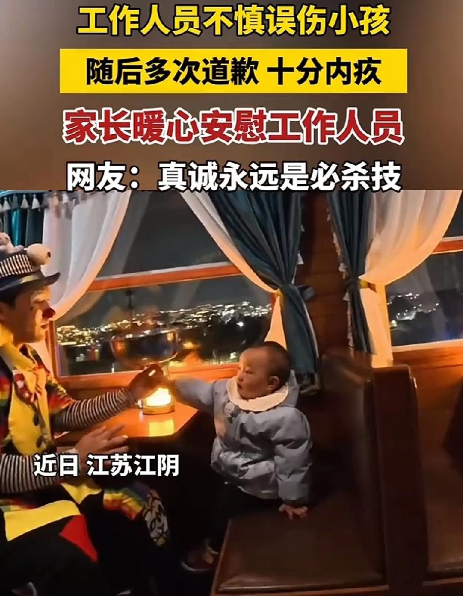 近日,江苏江阴。宝妈带着萌娃去景区玩。工作人员扮成小丑和萌娃互动,拿着盆在他的眼前旋转。萌娃看得眼花缭乱,不禁乐的手舞足蹈的。 萌娃正开心的时候,小丑表演失误,盆沿碰到了他的脑门。萌娃嘴一瘪,眼看就要晴转雷雨。 小丑赶紧道歉,轻揉萌娃的脑门。宝妈也在鼓励宝宝要勇敢,不要哭。哥哥不是故意的。萌娃觉得自己是个小男子汉,不应该哭。硬生生的憋住了哭声,止住了眼泪。雷雨化于无形之中。 小丑很内疚,多次道歉。称自己也有小孩,碰到了肯定疼。宝妈安慰小丑,没事。不要放在心上。并对萌娃说:“和哥哥说,没关系”。萌娃果真说“没关系”,并和小丑击了掌。 宝妈真诚善良,理解工作人员的不易,反过来宽慰工作人员。也很会教育孩子,让孩子学会坚强。 生活中常会遇到一些磕磕碰碰的事,解决问题,真诚是永远的必杀技。 表演人员误伤小孩反被家长暖心宽慰萌娃真诚善良 教育孩子