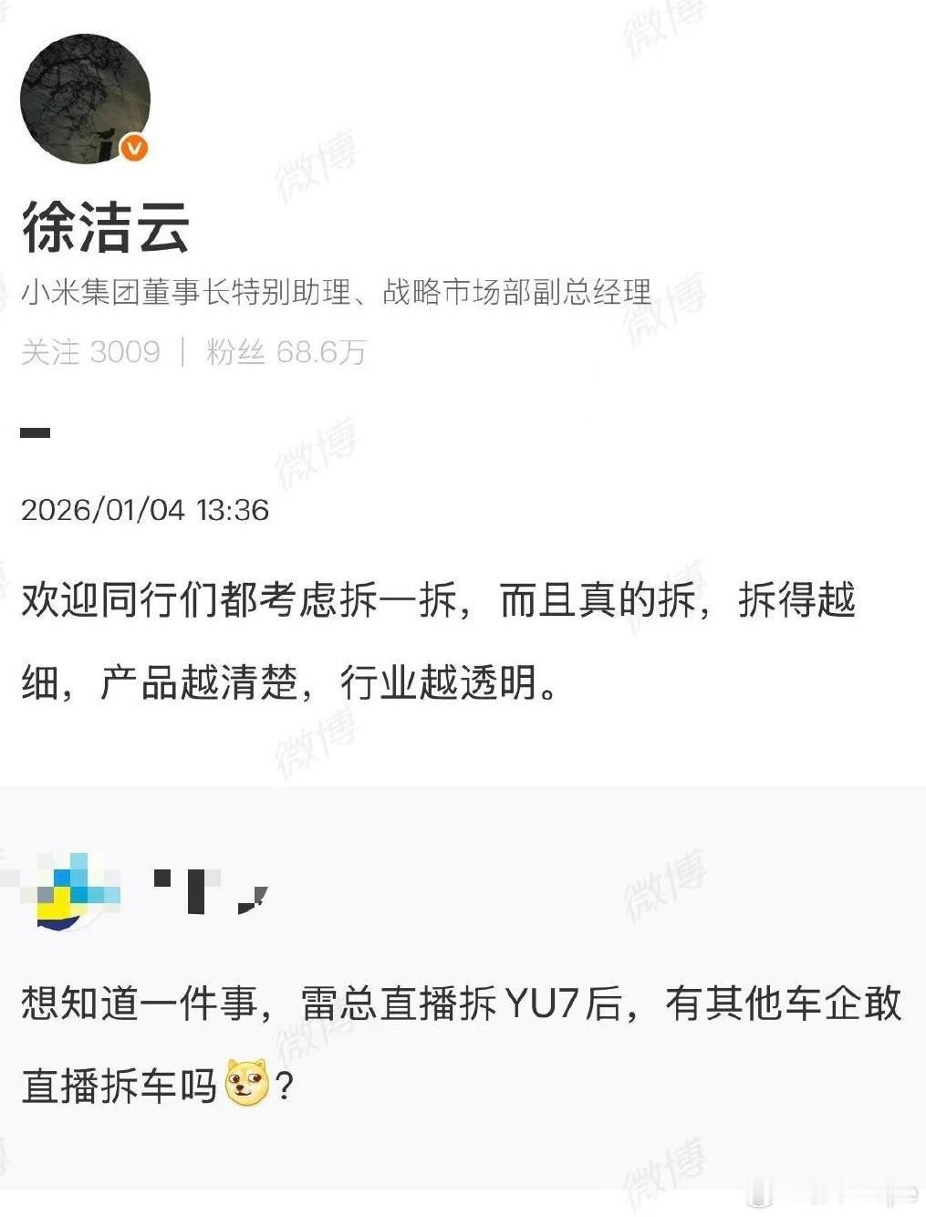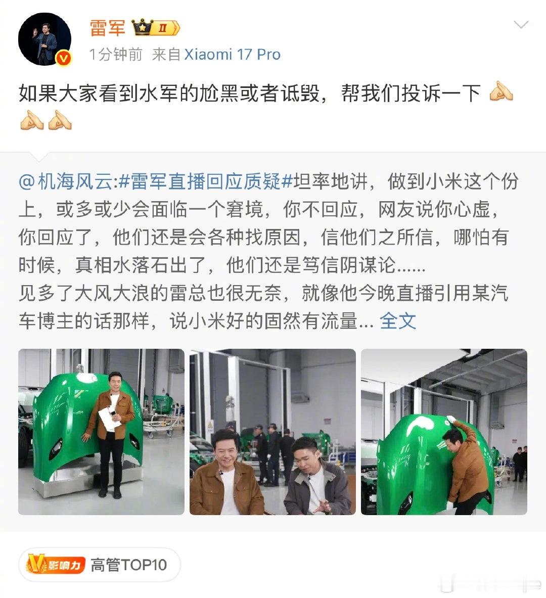 徐洁云回应小米汽车被叫绿化带战神雷军谈小米汽车创造奇迹原因雷军回应小米汽车创造行业新纪录中国汽车报小米硬核拆车背后的产业坚守4小时硬核拆车,小米这波坦诚赢麻了~ 不玩花哨营销,直面安全争议,拆用料、讲结构,把“丢轮保车”“超强钢”的质疑一一说透交付破41万的底气,藏在敢公开“解剖”的坦荡里,中国智造的硬核,从来靠实力说话~小米YU7中国汽车产业技术为王雷军直播回应质疑雷军直播拆车大v聊车