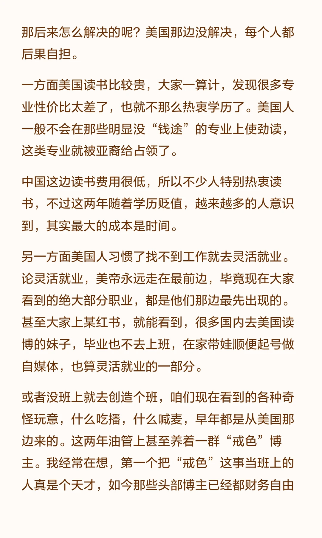 我以前一度理解不了美国那边为啥大家读博的激情那么弱,后来知道他们已经经历过了我们当前这种情况。上世纪80/90年代,大学生供应太多,导致根本没有那么多岗位。美国那边私营为主,国家没义务解决就业,很多文科和理科博士去加油站工作作为过渡。