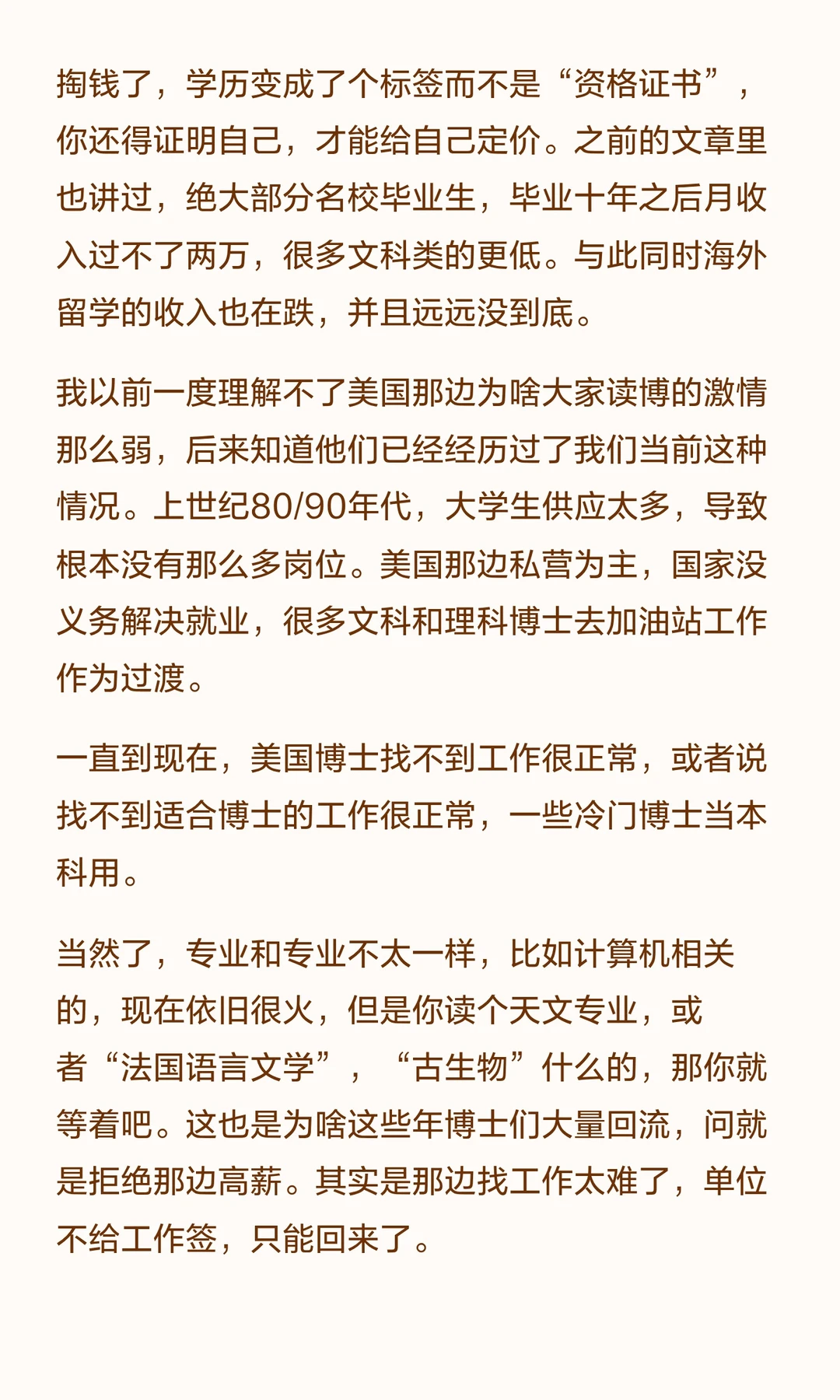 当然了,专业和专业不太一样,比如计算机相关的,现在依旧很火,但是你读个天文专业,或者“法国语言文学”,“古生物”什么的,那你就等着吧。这也是为啥这些年博士们大量回流,问就是拒绝那边高薪。其实是那边找工作太难了,单位不给工作签,只能回来了。