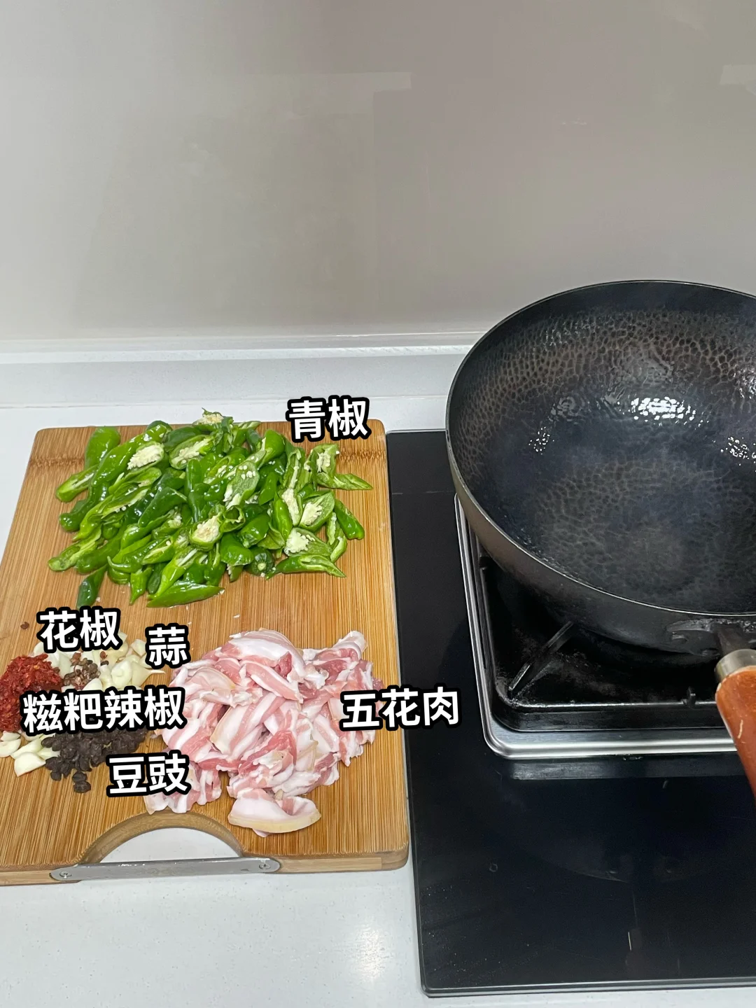 1⃣️先将五花肉切片,然后辣椒切滚刀块儿,再准备一点蒜、豆豉、花椒。一小勺糍粑辣椒备用。